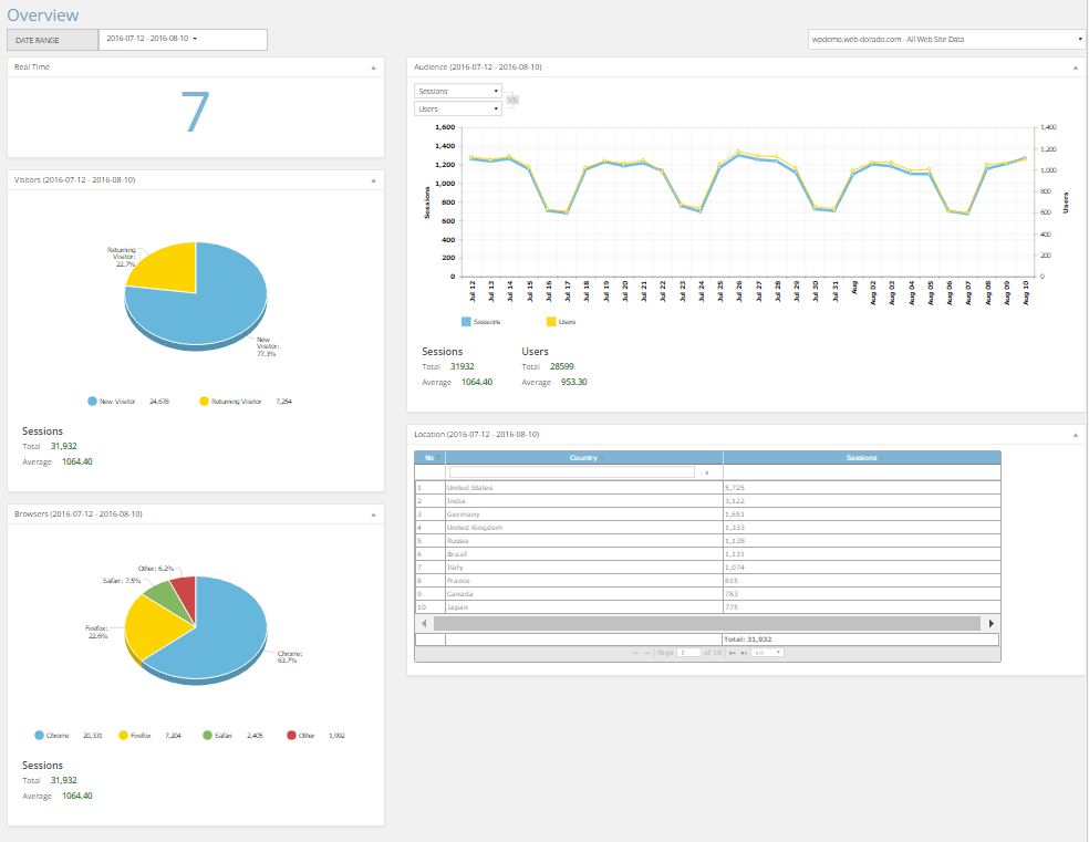 The overview page gives you a quick insight into your website’s real time visitors, audience, browsers used while interacting on your website, and user geolocations.