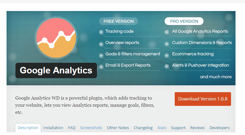 The first thing you’ll have to do to get Google Analytics WD is to head over to wordpress.org , where you’ll find the FREE version of the WordPress Google Analytics plugin for downloading. You click on the download button and the plugin files will start downloading in a zipped format. The FREE version of the plugin is still pretty cool and feature-rich, but for some additional functionality you’ll have to upgrade it to the Google Analytics WD PRO.