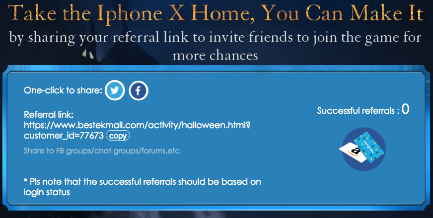 You’ll click the Start button and it will show you the different things you win. Every day through Halloween you can log in and flip five more times to see if you win. From there, you can take your referral link and send it out to your contacts to get more chances to win.