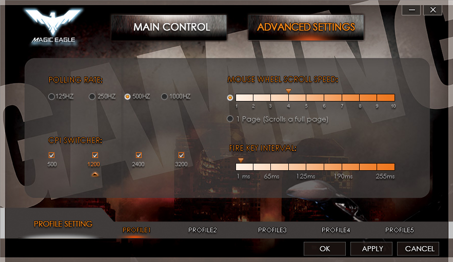 The Main Control configuration screen is pretty straight forward. The 7 programmable buttons are clearly laid out for you. Each number corresponds to button indicated on the left. You can also save up to 5 profiles for the Havit Magic Eagle Gaming Mouse. I really like that you have access to 5 profiles. If you have several users at home and they will be using this mouse, you can easily set up a profile for each user. Nothing is worse to a gamer than to have your settings messed with. If you are the sole user, you’ll be happy to have 5 profiles because those profiles will allow you to customize different settings for different games. Profile 1 can be your FPS profile, profile 2 can be your brawler profile, etc. etc. This is especially useful once you start configuring macros actions. Simply click on a button and select “assign macros” to get started. The advance tab offers you the ability to change the polling rate, DPI switch setting, mouse wheel scroll speed, and fire key interval. Not too much flare here, friends. The only thing I would adjust on this screen would be the mouse wheel scroll speed. You want to adjust it to your liking. The fire key interval determines how fast you’ll be firing. The default is pretty quick at about 10 ms but you can adjust that anywhere from 1 ms to 255 ms fire rate.