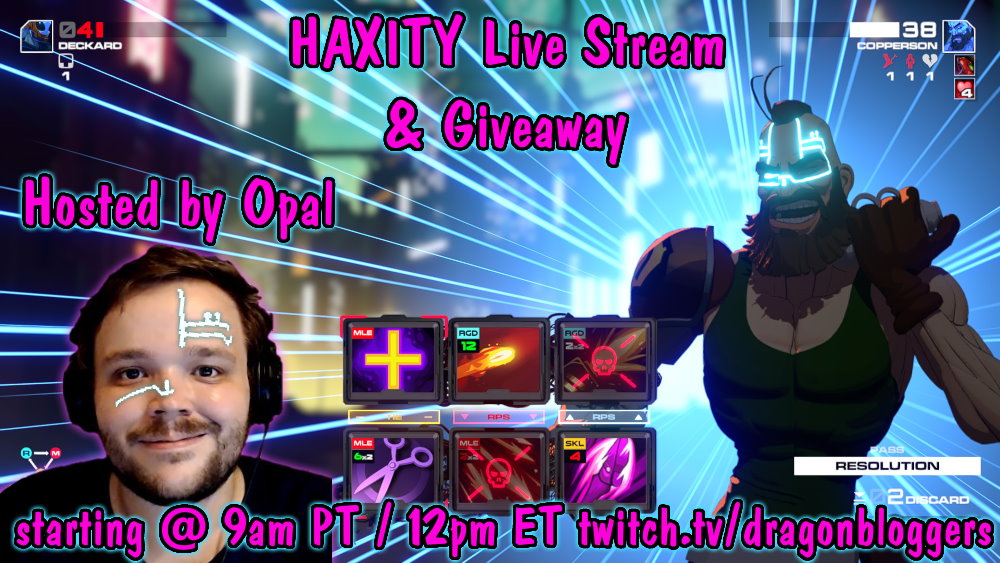 Today on the Dragon Bloggers Twitch channel at 9am Pacific Time / 12pm Eastern Time we will be doing a 3 hour coverage of the Cyberpunk-ish card battler Haxity. The developers Megapop have a special event going on where the game will be free to try for everyone on Steam and during this event we will be giving away 5 permanent full copies of the game, each copy with a retail value of $12.99.