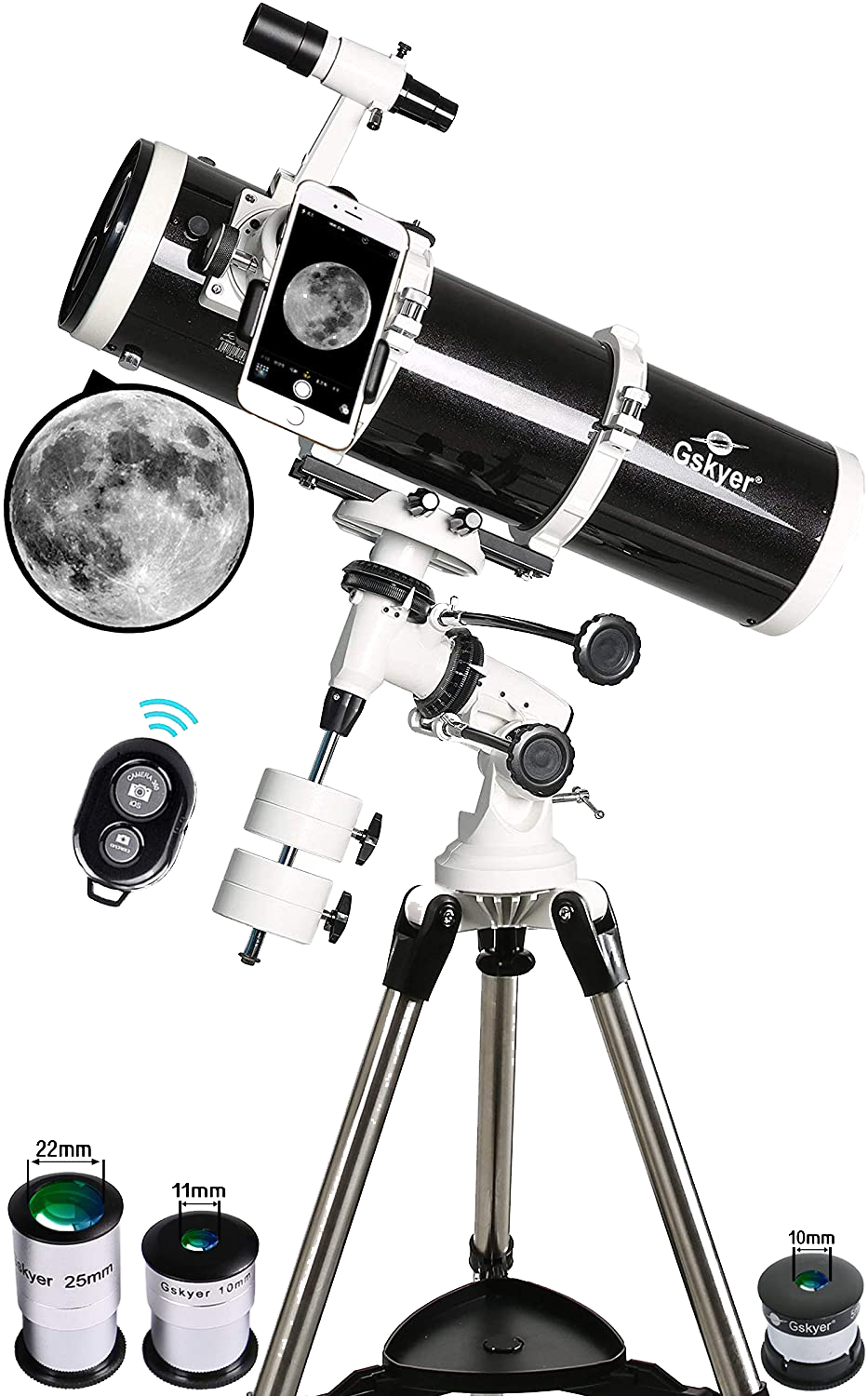 This model is from the Gskyer company, and is analog, meaning no power is needed for the telescope itself. It weighs in at thirty pounds, is centered on an equatorial mount, and features both a Barlow reflector and eyepiece. It comes with three easily changed eyepieces, a wireless smartphone adapter, alongside a remote. Simply hook your smartphone into the adapter, sync the remote to your phone via Bluetooth, and you’re ready to snap pictures of everything you gaze at. It also comes with a one-year care warranty, and lifetime maintenance.