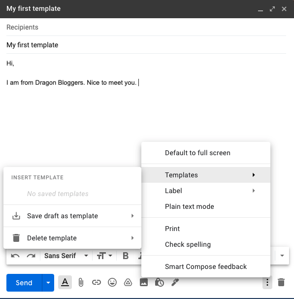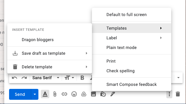 - Secondly, you will need to write your email as usual. Don’t forget to include the subject line. After you finish writing, navigate to the bottom right of your compose window. There is a three dot button. Select it and then select Templates. Another tool will show up, choose Save Draft as template. This option will ask you to create a new template or overwrite an existing one. If you create a new template, don’t forget a unique name for your template as well.