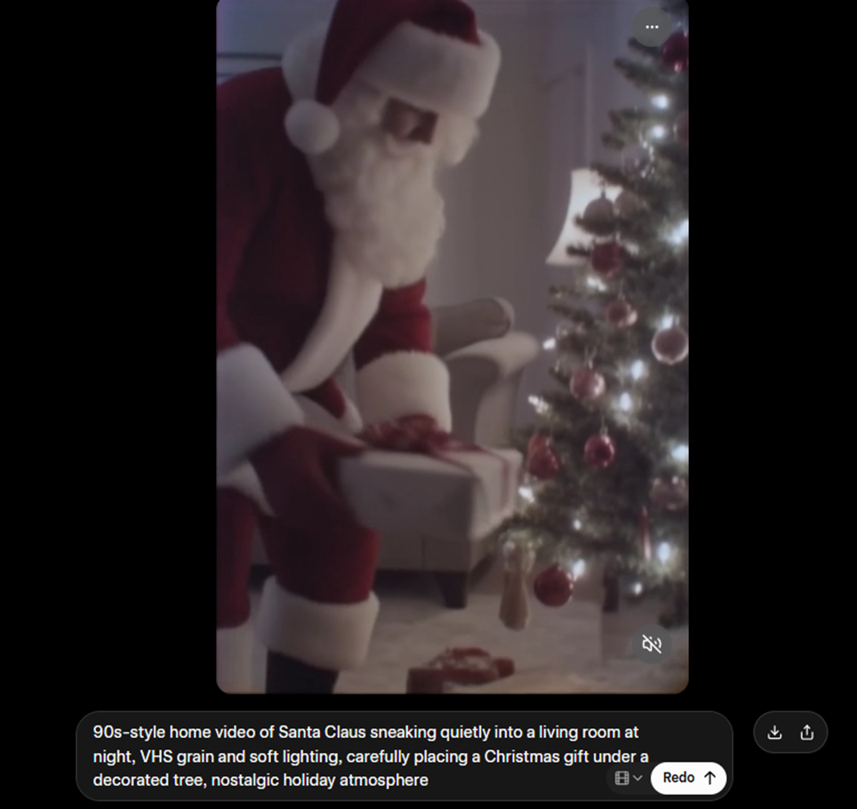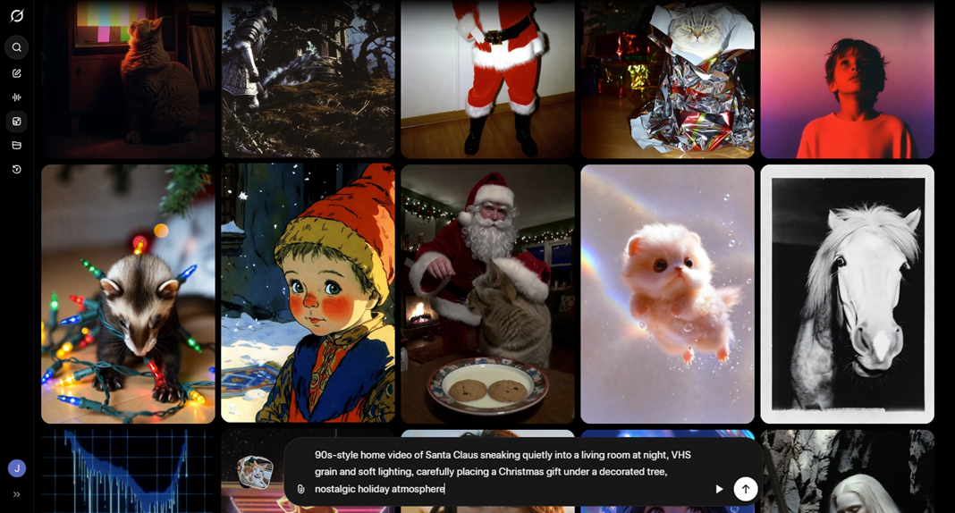 To generate a video, go to the “Imagine” section, which is the fourth option in the left-hand interface. This section lets you generate both images and videos. Once there, you can see a huge number of videos created by other users; many of them are amazing, and this is where the magic begins. In our case, we had the AI create a 90s-style video of Santa Claus delivering a gift in a Christmas living room.