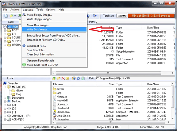 Now that the ISO is loaded in the home screen, plug in your USB/pen drive (Should be at least 4GB or above). Once the USB has been loaded, go to the “Bootable” tab in top bar and select “Write Disk Image”.