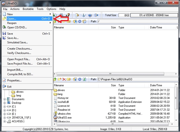 It’s quite a Child’s play now after you’ve installed the Ultra ISO, in my opinion the whole tutorial seems to be a child’s play. Well once the program is installed, open it, click on the “Files” tab on the top bar, then select “Open” and browse towards the directory where your ISO is located and open it.