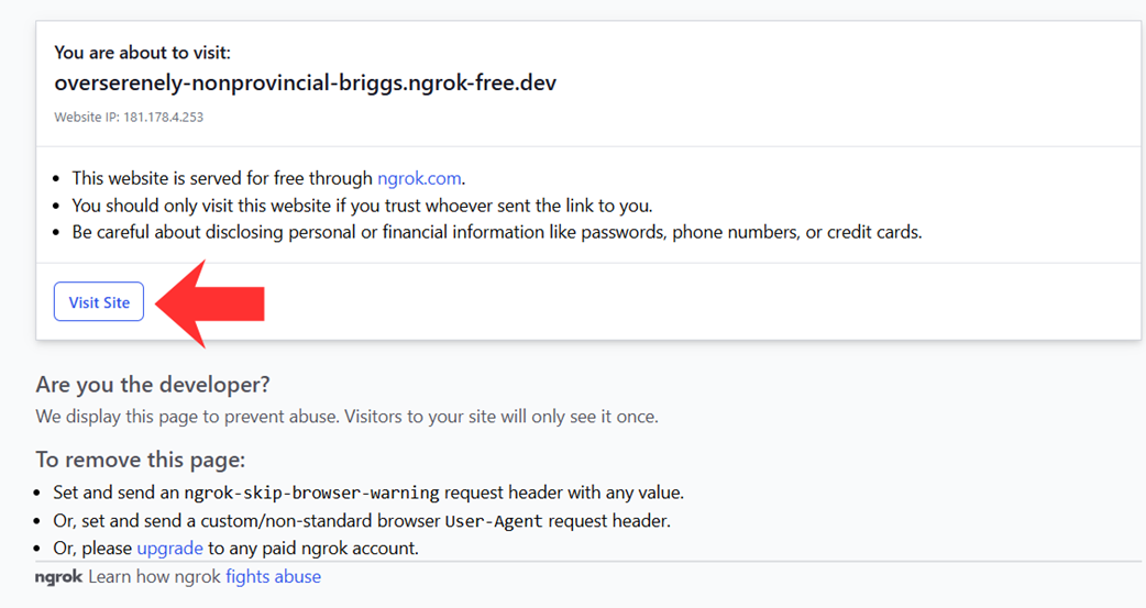 Once the link opens, ngrok will display some recommendations and security notices. If everything is correct, simply click "Visit Site" and that is it. Your server, which previously only worked locally, can now be shared over the internet, even if your testers are not in the same city.