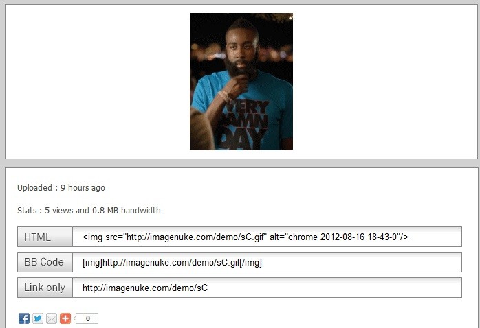 Another great feature of ImageNuke is the sharing options. With a click of a button, you can share your images to many social networks with extreme ease. Being an online presence, it’s great to be able to share uploaded images with ease. Anything that can get more eyes reading what I’m doing the better. And speaking of sharing, once your images are uploaded, you will have access to the sharing codes to post! Whether you are looking for the HTML, BB, or Link only code, ImageNuke makes it easy for you to copy and paste and get that image out onto the internet.