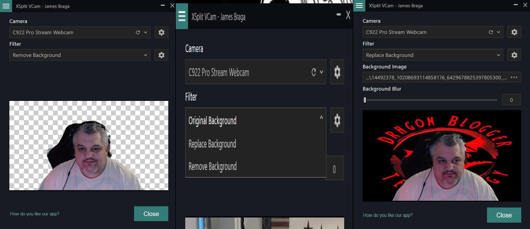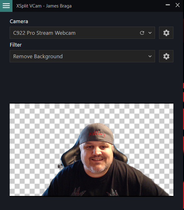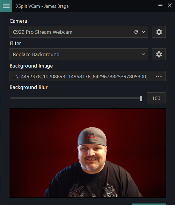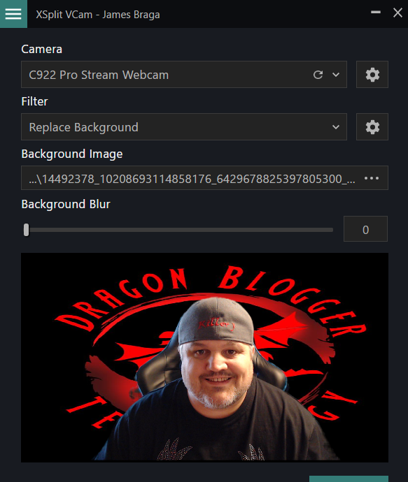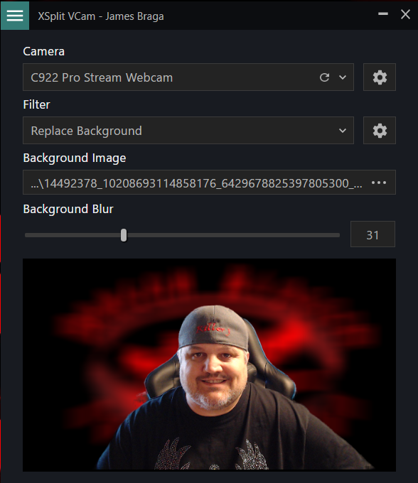 The next settings are camera choice or background. You can choose which camera to use if you have more then one connected. I used my Logitech C922x Webcam. You can also choose to use the normal background or add your own background. This also gives you the chance to remove the background completely.