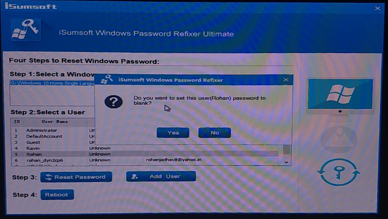 If you have purchased the paid version, then you can reset the password of the already created users. Simply select the username whose password you want to reset and click on Reset Password. It will then ask you if you want to set the user password to Blank. Say Yes. This will reset the password of the selected windows user. Click on Reboot to restart the computer and you will have removed the password of the selected user. Note: To reset windows domain administrator/user password, you will require the ultimate version of the software.