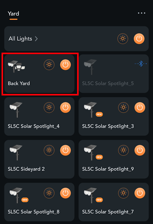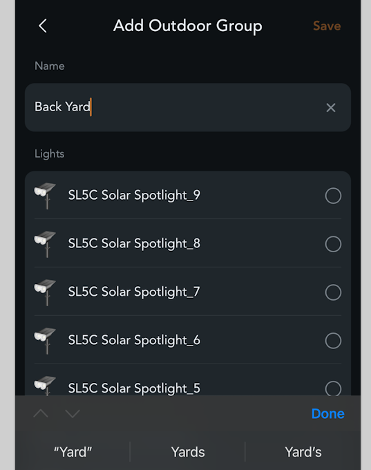 Name your group and then select which of your lights you want to be in that group, I just made things simple and put all 8 SL5C Solar Spotlights into a single outdoor group called Back Yard.