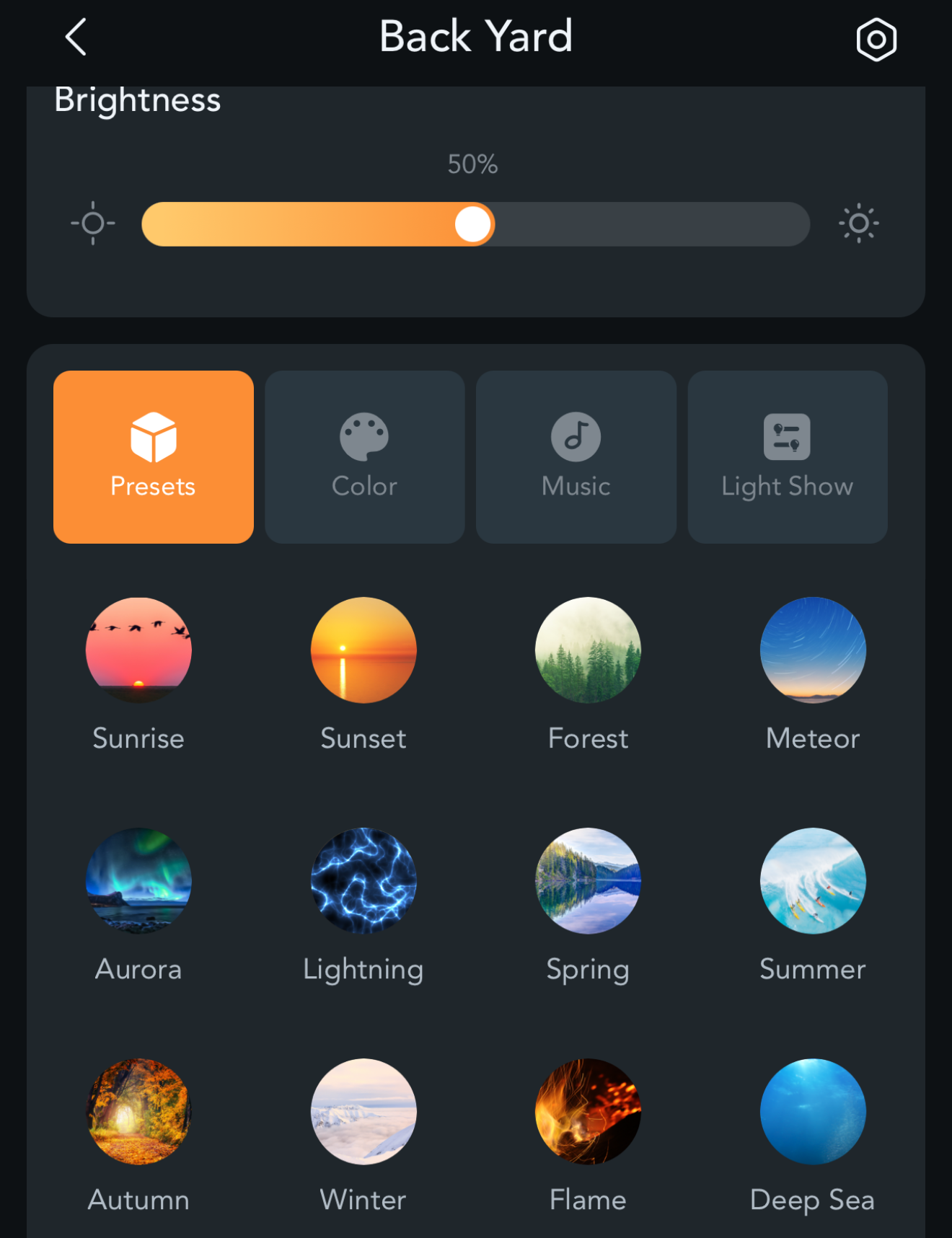 This includes any presets, colors, music syncing, light show and brightness levels.