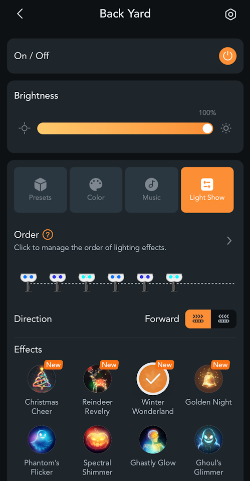 My favorite mode however is light show, and this is the perfect mode for holiday seasons when you want to make your lighting more festive. You can even pick each specific light that you want to be in the mode and the direction of the Light Show.