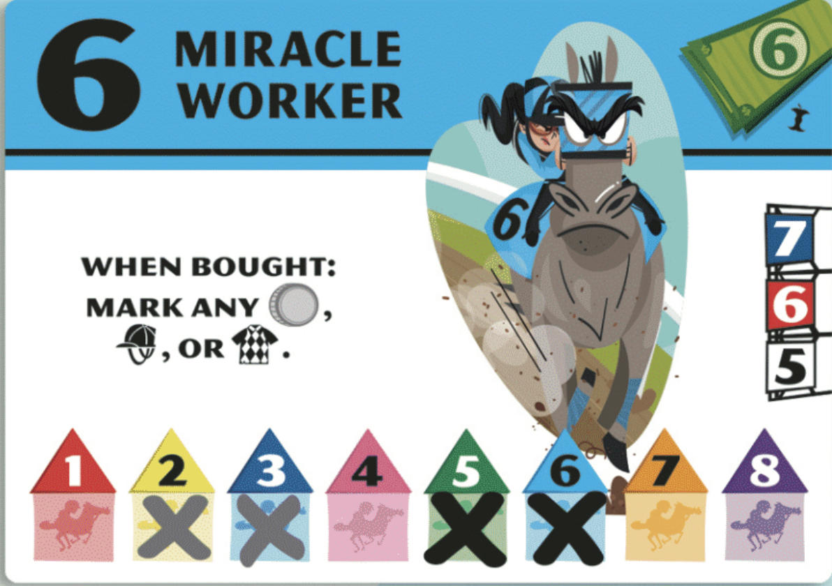If the player has enough money, they can buy a horse that matches the number on the horse dice. However, there is a catch. Players cannot buy the horse from others. They can only buy the available horses, and the horses must not cross the finish line yet. Owning the horse(s) provides players with different abilities. Some horses have special abilities when being bought, while the others have special effects when another action is triggered. Not only does it provide extra power to the owner, owning the horse can also help players to earn a hefty sum amount of money if the horse finish within the top three.