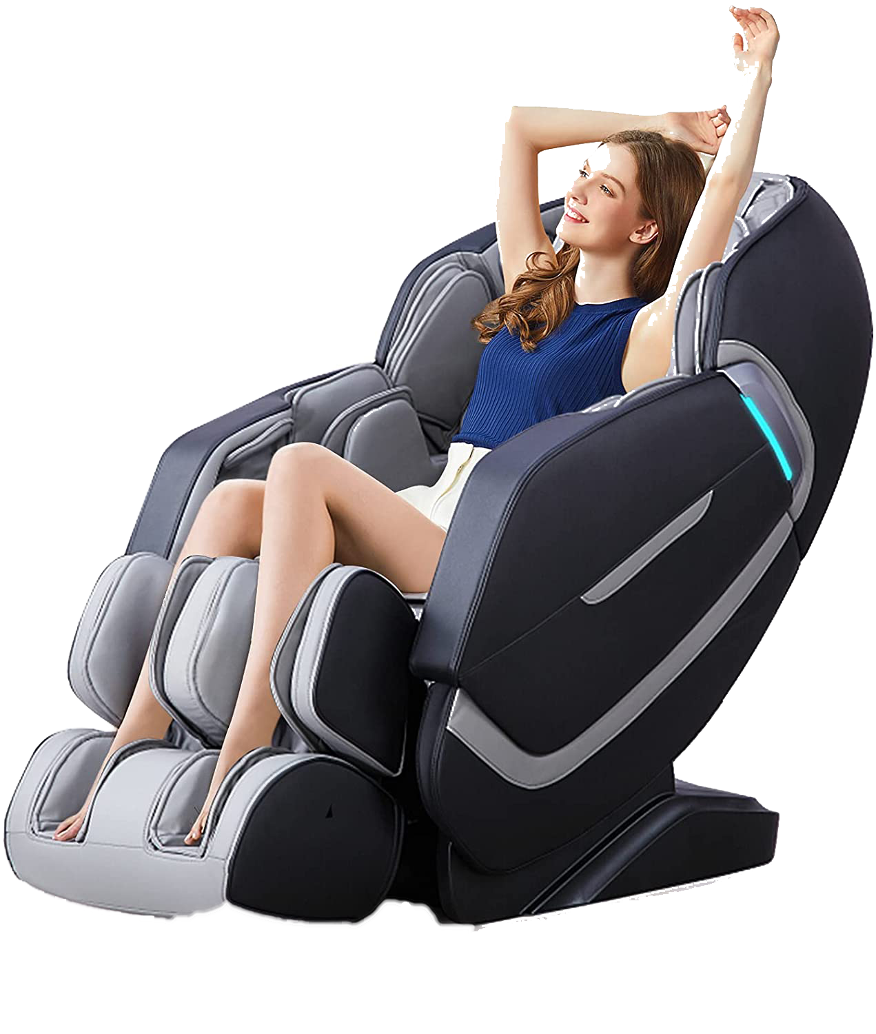 This chair comes to us from Mecor, and aside from a Bluetooth speaker, it features foot rollers, a waist heater, and full leather, black, modern design. It puts the center of gravity on your buttocks. It uses an airbag-based massage system, and pulse action. Its got a scalable calf section meaning this chair can handle users of different heights, from 10-15cm maximum scaling. It features 14 massage rollers, back heating, an extendable footrest, and best of all, it’s a zero gravity chair meaning it reclines in a way that removes all the pressure from your body.