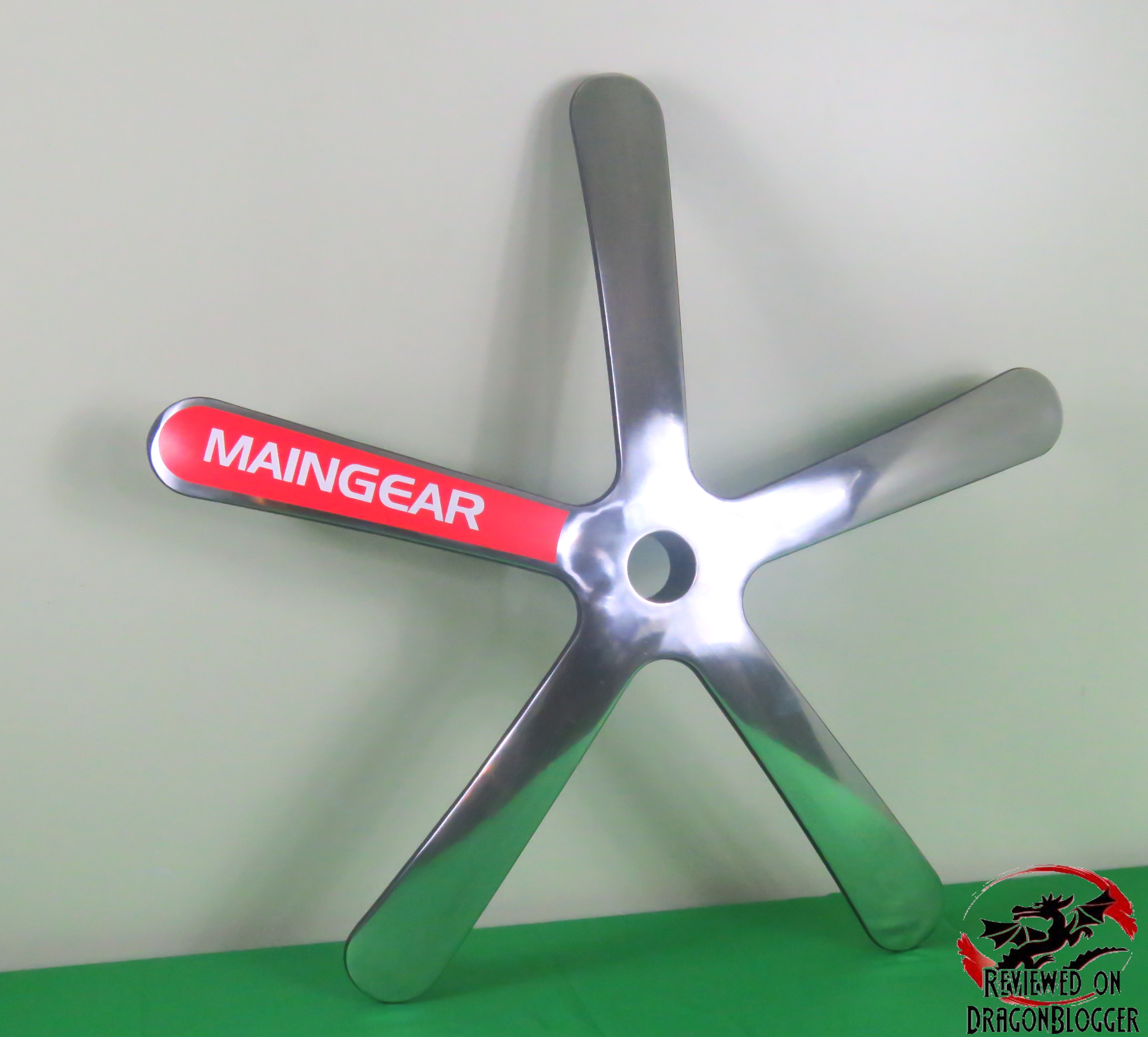 This is the very reflective aluminum alloy wheel base. Very classy the way they accented only one of the 5 extensions with the red strip and the white Maingear branding.