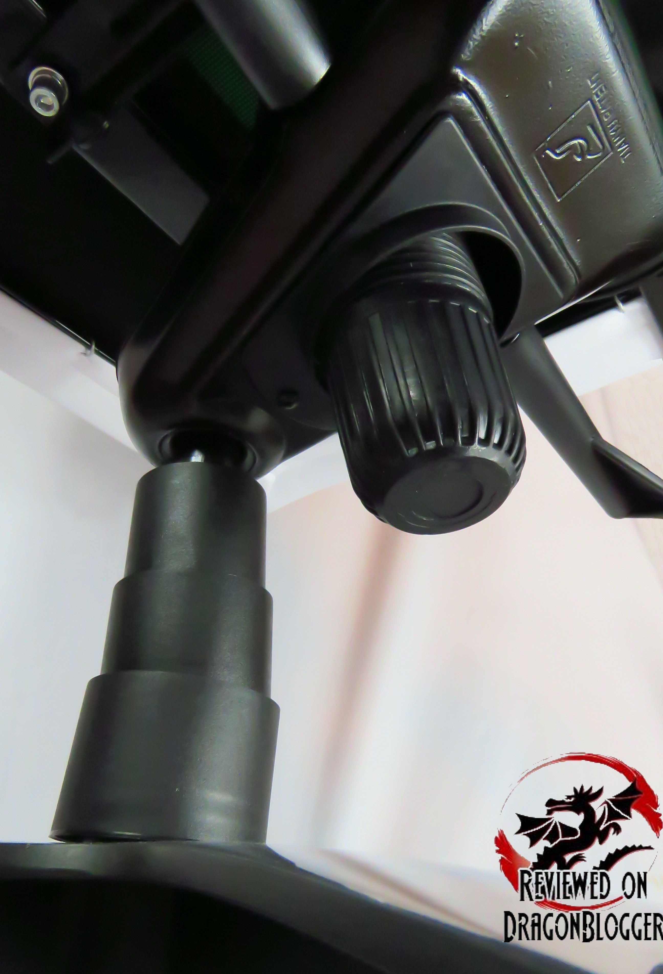 Looking under the chair, we see the 2 adjusting levers and the multi-tilt control adjustment knob as well as the telescoping cover that covers the piston. The knob loosens or tightens the rocking that can be done on this chair.