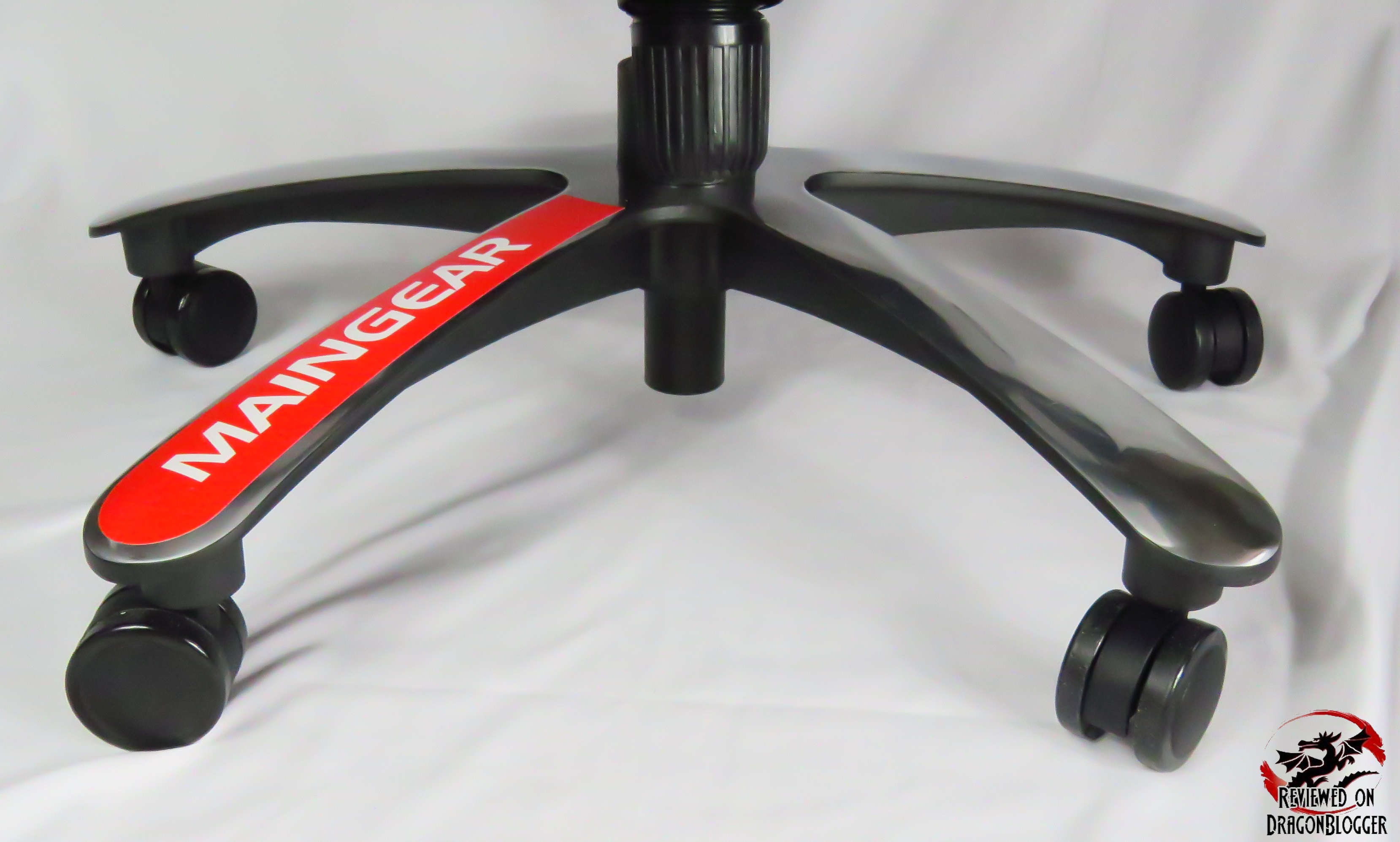 This is the base of the chair. Usually they are dull black bases with no flair, but this one comes beautifully chromed along with one special leg of the chair with a nice red racing stripe with the Maingear name on it printed in white.