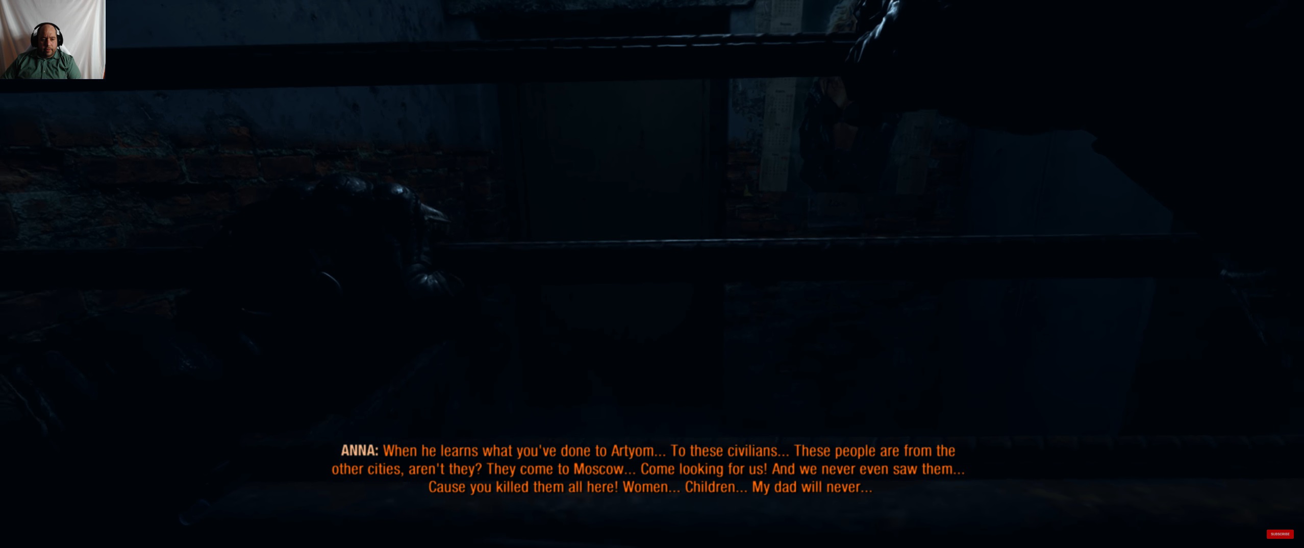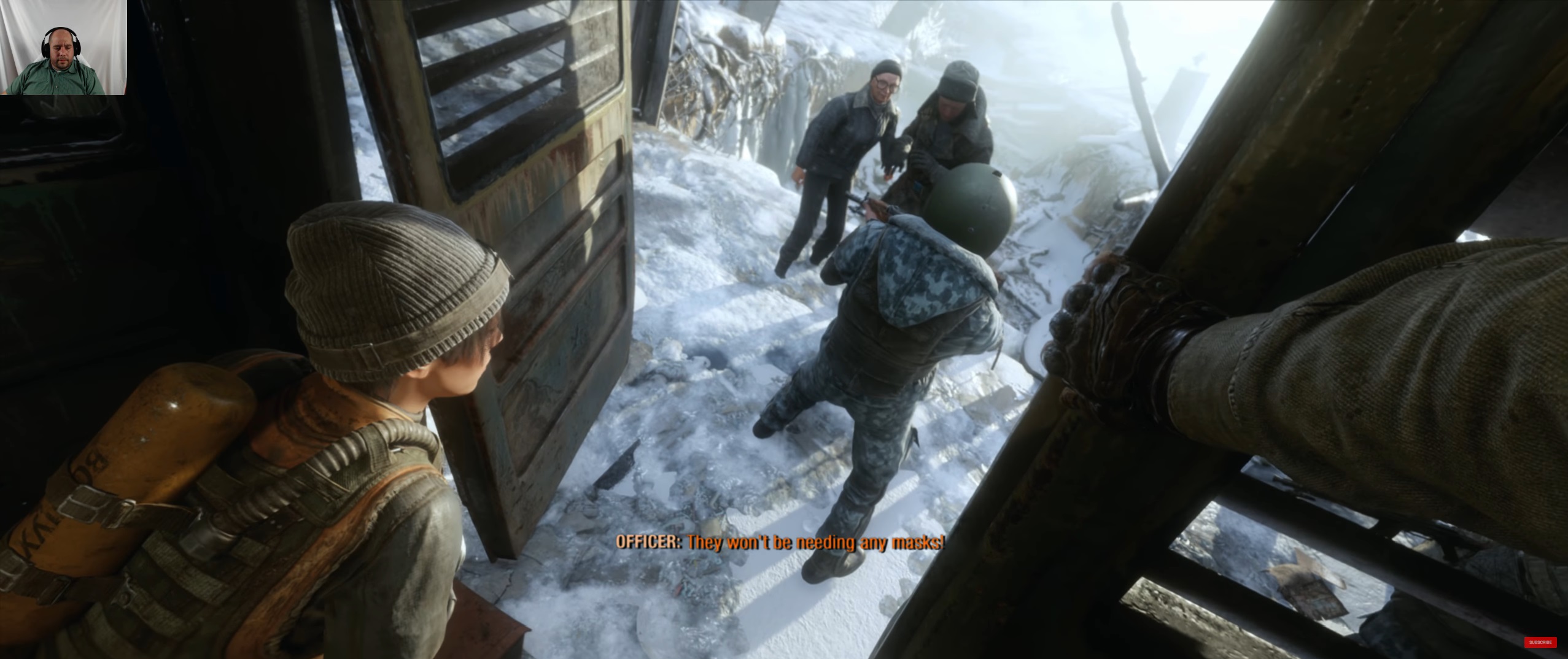 The van stops and we are pulled out of the van, the elderly couple first and Anna mentions about giving them their masks back, but the soldier states “They wont be needing any masks”, it looks like they are going to execute us…. But they don’t know, I am Artyom.