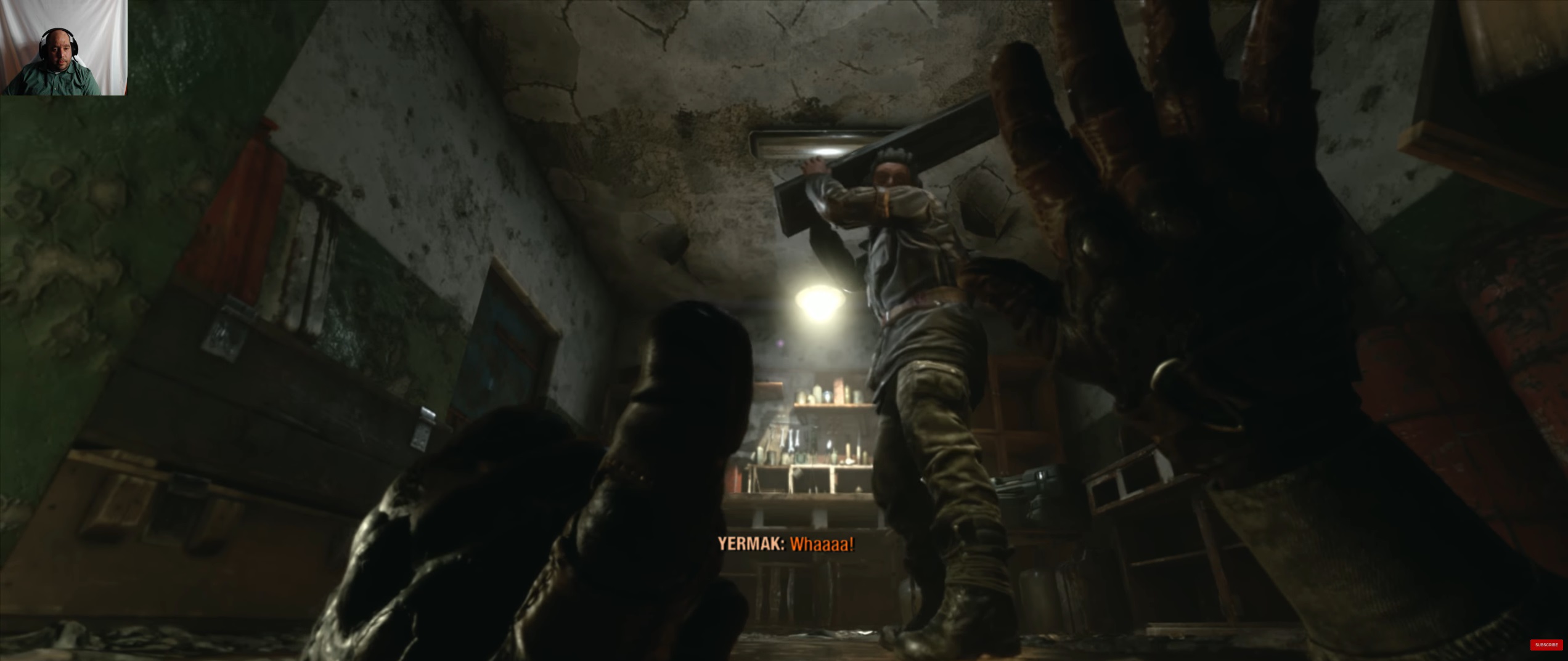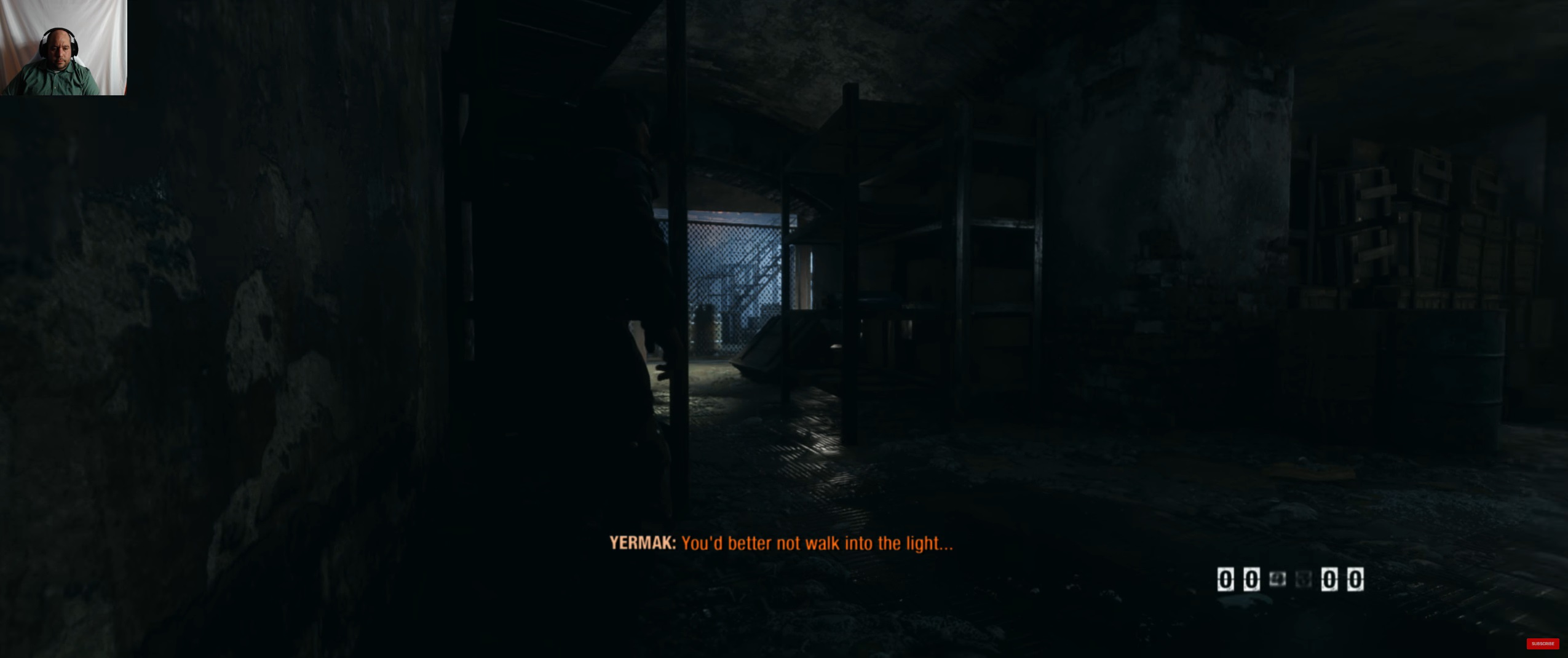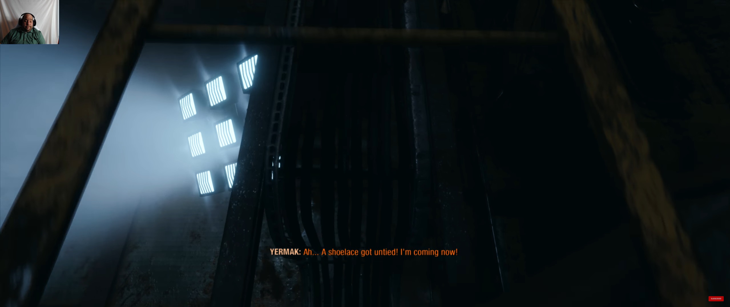 After a few seconds of crawling, I come to this guy, time to snap a neck.  Yermak visits me up here on the rafters, where now we can walk, but everything is still sooooo dark.  Yermak leads me to this door.