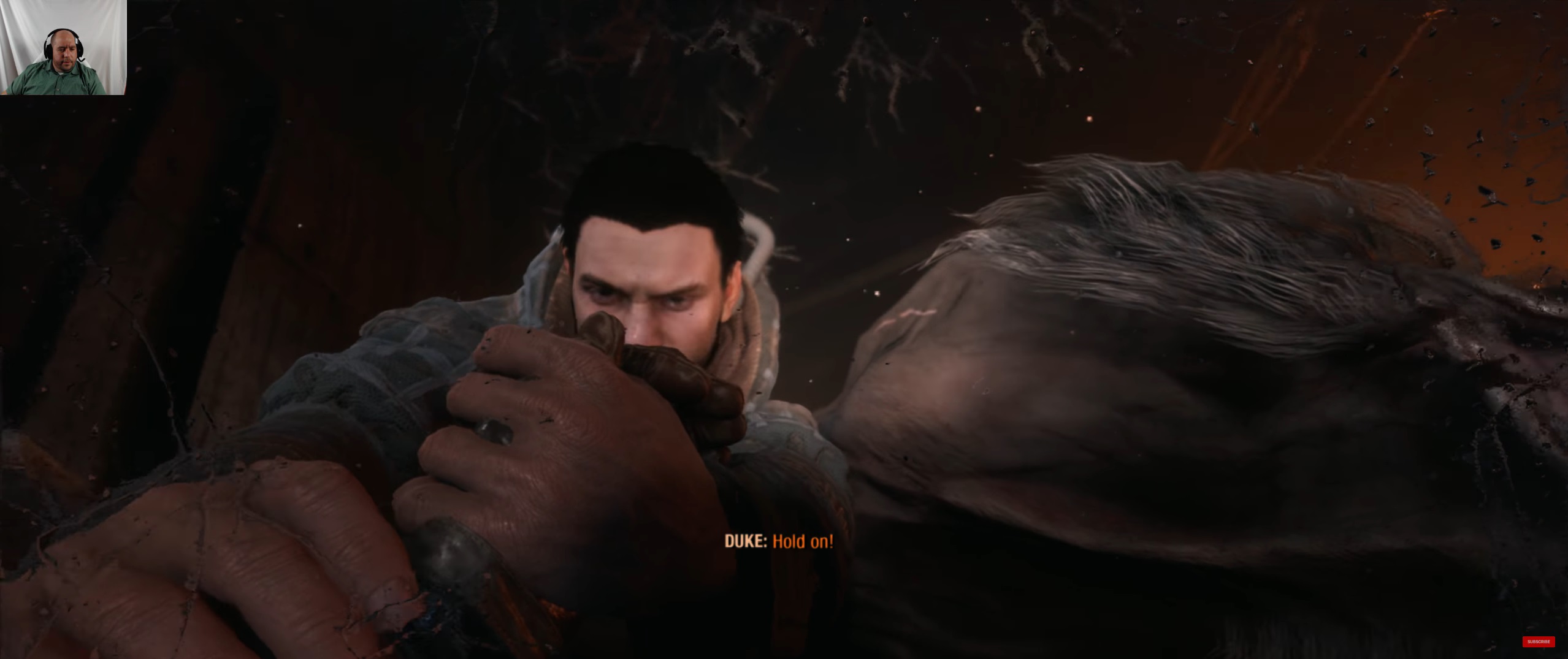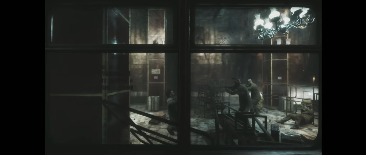 After busting the vent and kicking through the door, I find the commander pushing Anna down and getting ready to shoot me down.  I start to struggle with the commander who pushes us both into that room behind us, where we are met with another person with a gun.