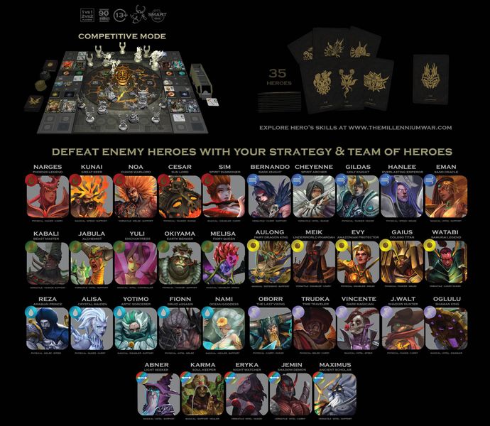 Fortunately, a lot of board game designers and publishers have been working hard to bring the digital MOBA to life. This year, Winged Titan joins the force, to release their first ever project – The Millennium War. Even though the Millennium War might not be the first MOBA board game adaption, it is unique enough to be the first of its own. The game took place in another Universe, where the legendary Millennium Gate is the source of all the elements. It releases its cosmic energies in the form of power beats, sacred weapons, and the forbidden-ancient spells. As a result, the world is divided into two sides to conquer and harness this unlimited source of power: the Virtues and the Sinners. These two sides, together with their heroes, will have to battle against each other in the Millennium War.