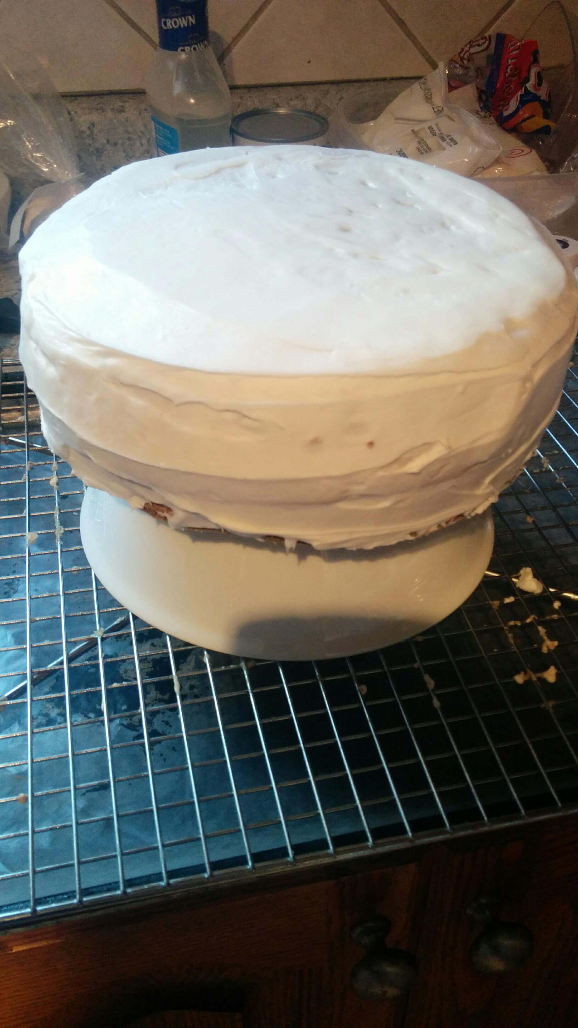 To start you will need to make your cakes. For this trial cake, I made vanilla from the box.  You can use what ever flavor or brand you like. Make sure to level the cakes. Add in your middle with buttercream or any filling you like. Next, you will ice the outside of the cake. For this first attempt I did not make sure it was all very smooth, but I will for the actual cake.  Once it is smooth, you will need to chill it in the fridge for at least 2 hours. I left mine in over night which made for a nice surface. Also, cake a cake board the size of your cake to place under the cake. This will make it easier for when you have to move the cake from one surface to another. I didn’t have one at the moment so I used my cake pan and measured one side of a box, cut it out and covered it with cling wrap.