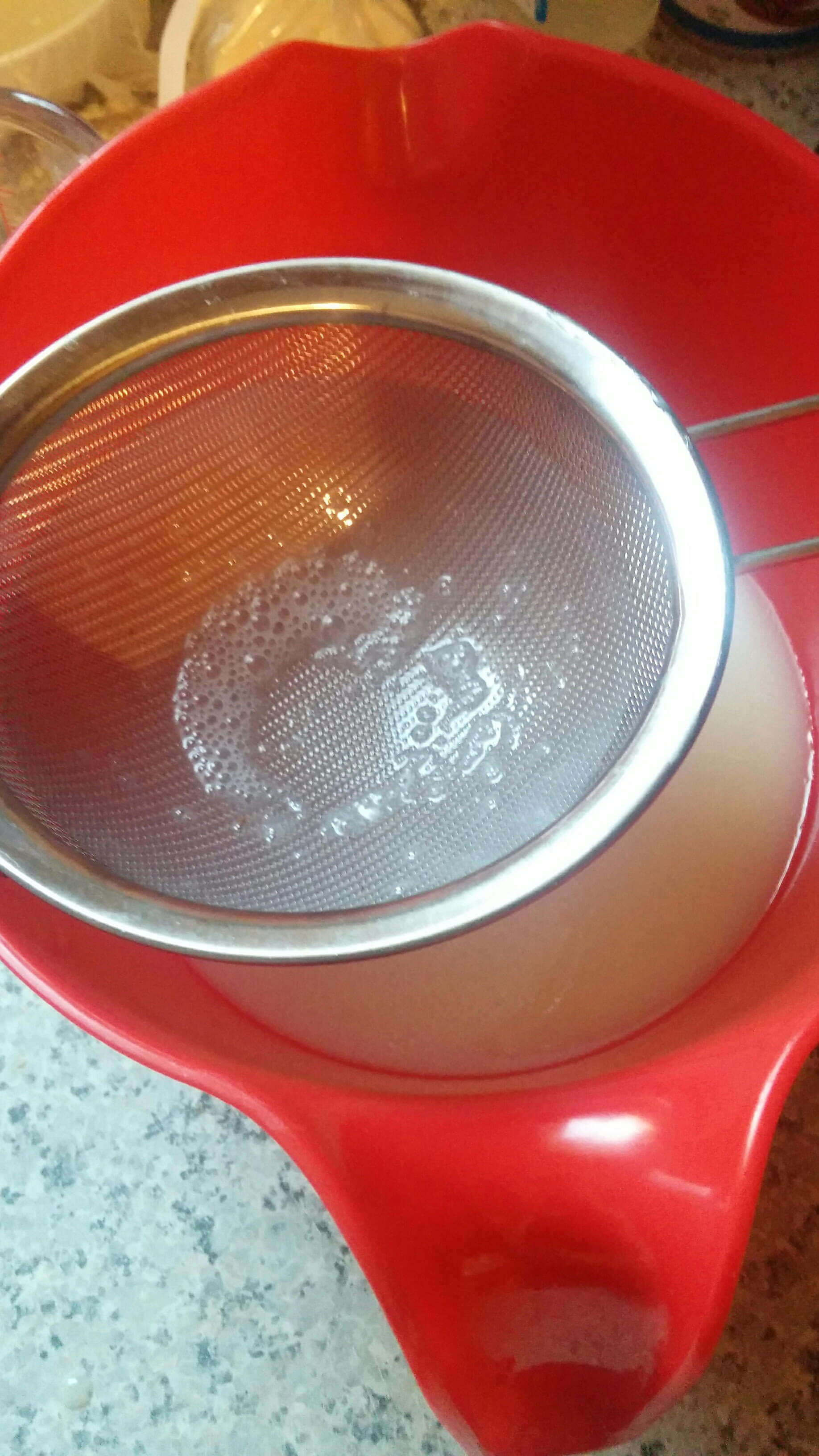 Next, you will want to run this mixture through a strainer to remove any possible lumps or air bubbles that have formed. You want a nice glassy finish so the less air in the glaze the better.