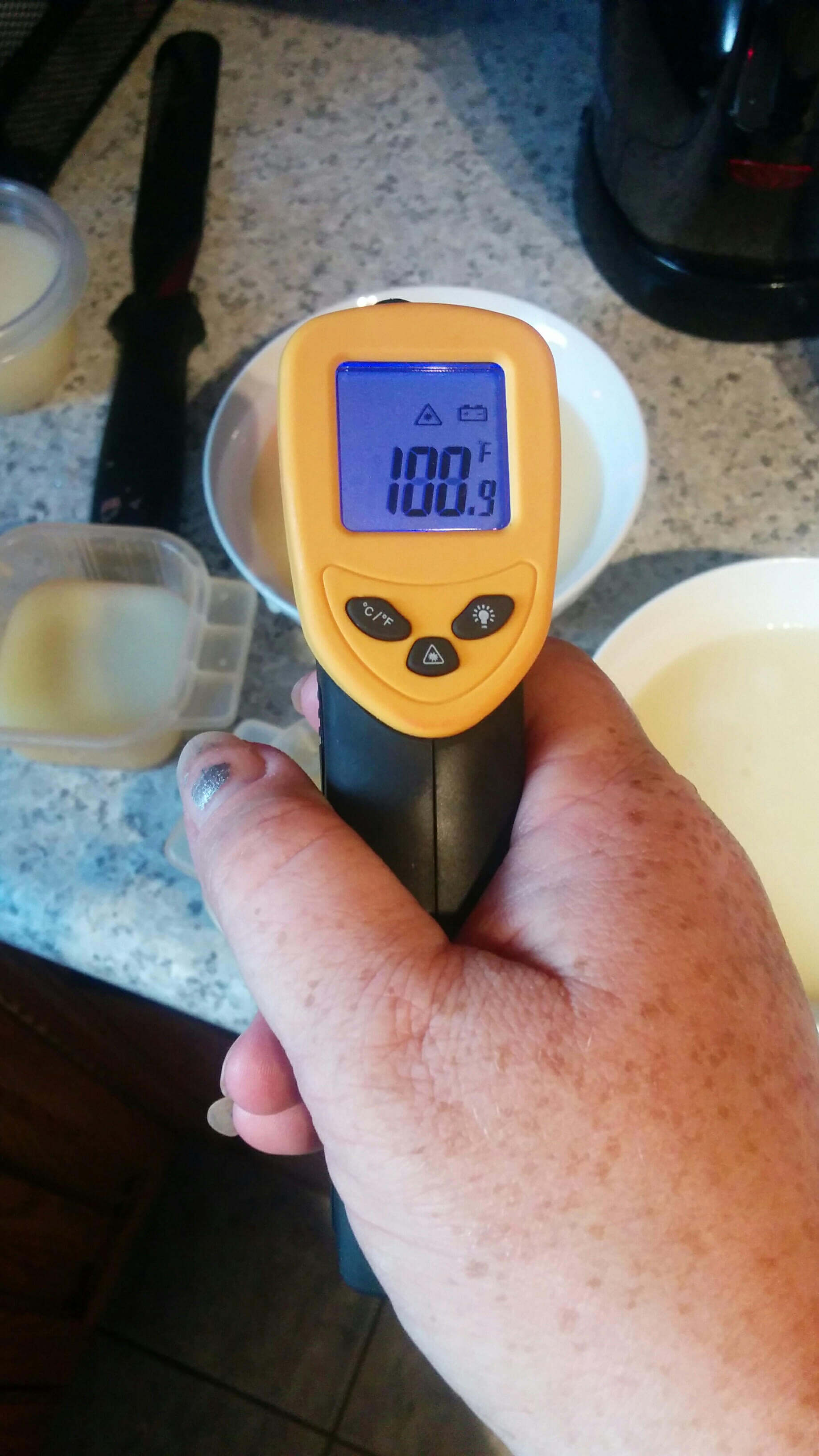 You need to separate the mixture into separate bowls. How many will depend on how many different colors you are trying to make, but I used 5.  I do not own a proper candy thermometer but I did review this laser thermometer a couple years ago and use it all the time and is very accurate for doing this as well.