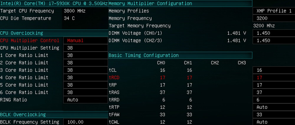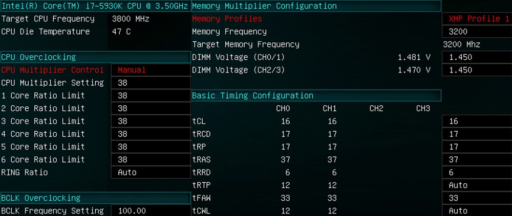 - BCLK (Base Clock): The base frequency of the CPU is running. It is derived by the multiplier of a CPU, in this case 35 times the base clock of 100Mhz for 3500Mhz.