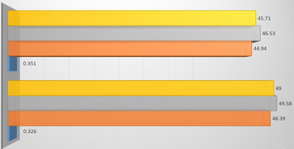 We can see here the results are a bit skewed, though still very close. Patriot XMP 1.0 performed best under Write at a .027% improvement and Read test at a .0614% improved and the HyperX XMP 1.0 performed best under Latency by a .51% improvement and Copy by a .50% improvement.