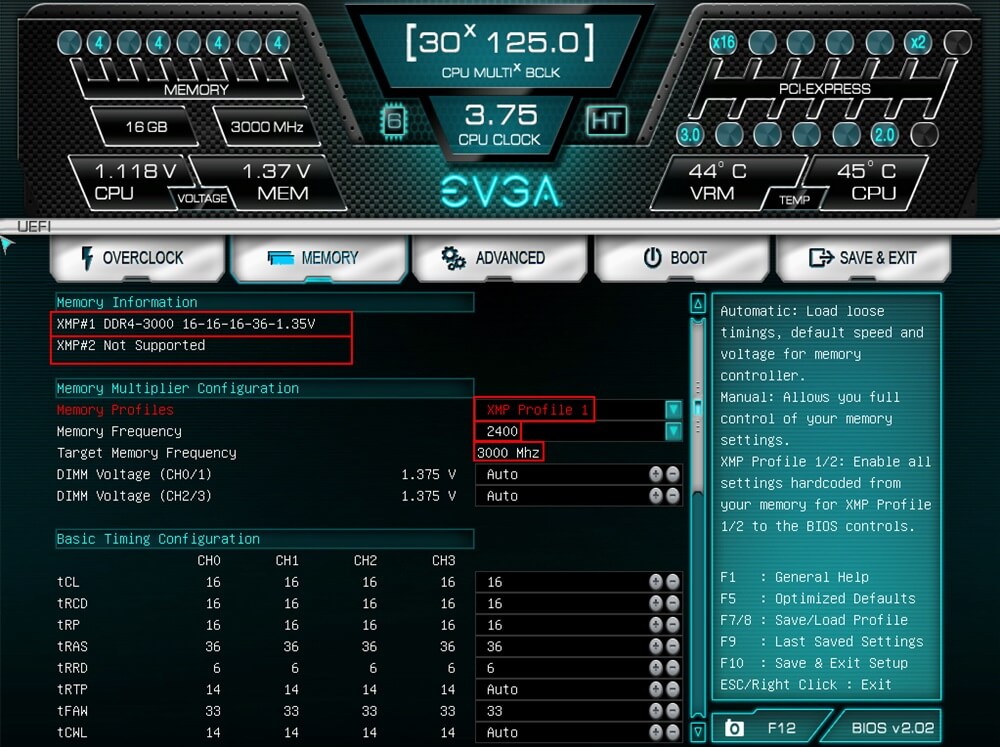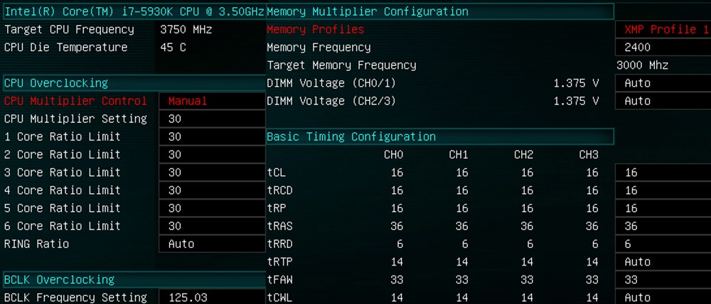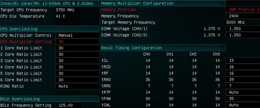 In the picture below at the bottom, you can see the BCLK is set to 125.03. If you start overclocking the BCLK too much you will start having to adjust vcore voltages, cpu voltage, memory voltages and more and then passed 125 can be a bit dangerous. Just above that you can see that the CPU cores have been downclocked to 30, so that would be 3000Mhz but that’s the CPU, we don’t want to underclock that do we? The trick here is that by raising the BCLK frequency to 125.03 Mhz, we have to multiply 30 by 125.03 which equals 3750.9Mhz, so actually the CPU has been overclocked just by setting the XMP Profile to profile 1. This also brings the memory frequency to 3000Mhz.