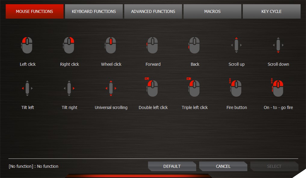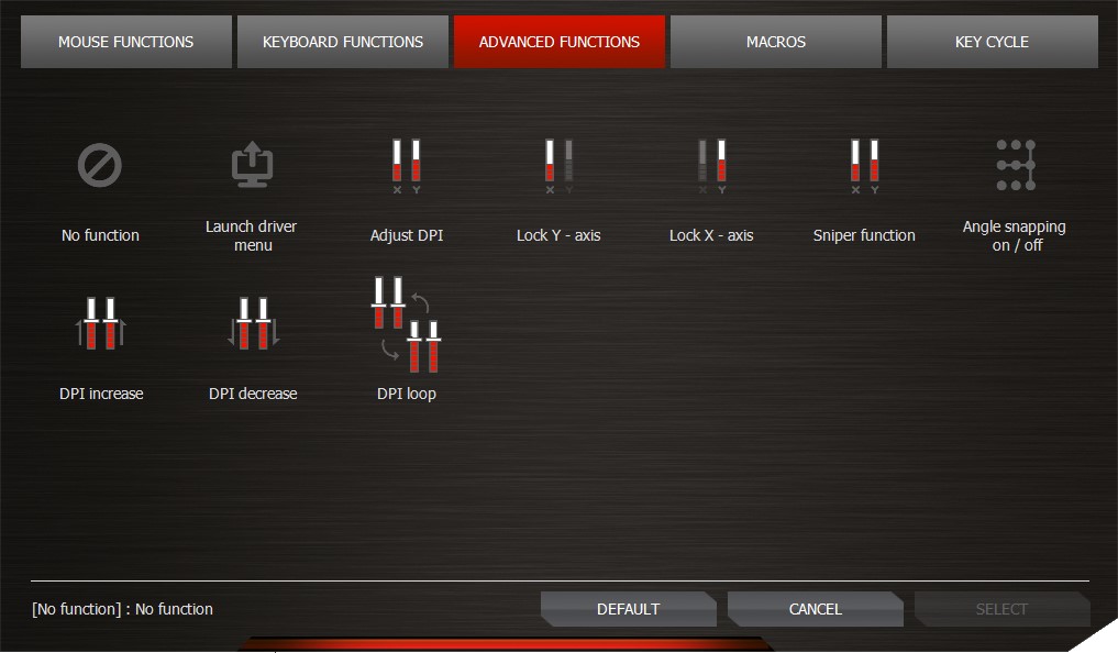 The “Advanced Functions” section, allows you to set some other pre-made functions, but these are a bit more advanced than the others. I like these options, here you can undo changes, adjust DPI, Lock Axis, Sniper function and more. Sniper function is pretty cool, it allows you to use the regular DPI speed you set your mouse to, then click and hold the Sniper function to reduce the DPI to a more precise speed and let go when you want your higher DPI.