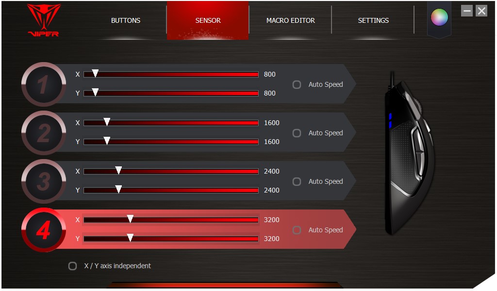 Coming out of the “Buttons” section (yes, everything until now has been in the “Buttons” section), we move onto the “Sensor”. Here you can change the preset DPI settings. You can also set the auto Speed and “X / Y axis independent” settings. Auto speed, allows you to automatically adjust the DPI in the range you setup according to the mouse movement speeds. The X / Y Axis independent function, allows you to these different DPI values for the X or Y axis’.