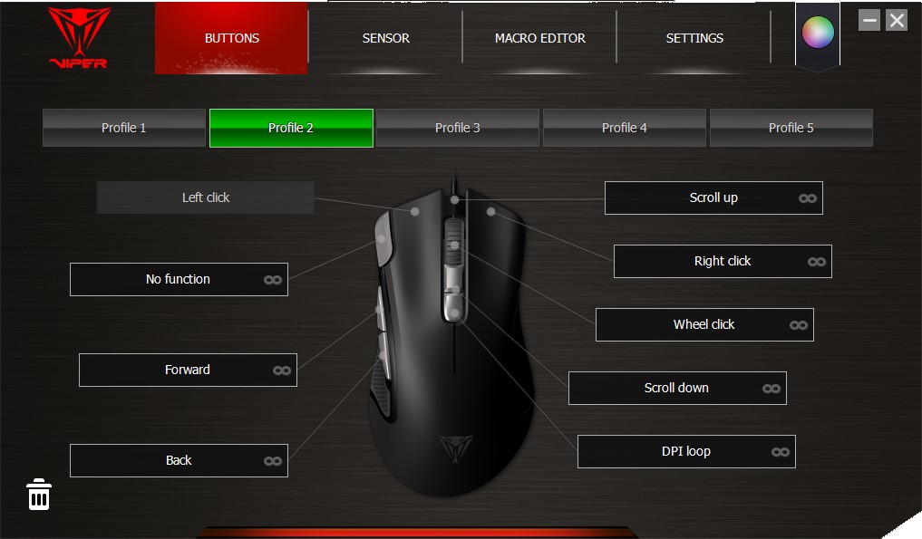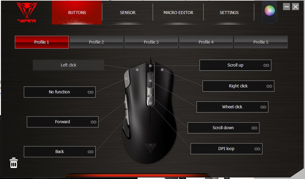 After installing the Viper Gaming Mouse Software and starting it up, we are greeted with this screen. The buttons screen allows you set all the mouse buttons the way you like, and even allows you to setup 5 different profiles to have a profile for every users or game you like.