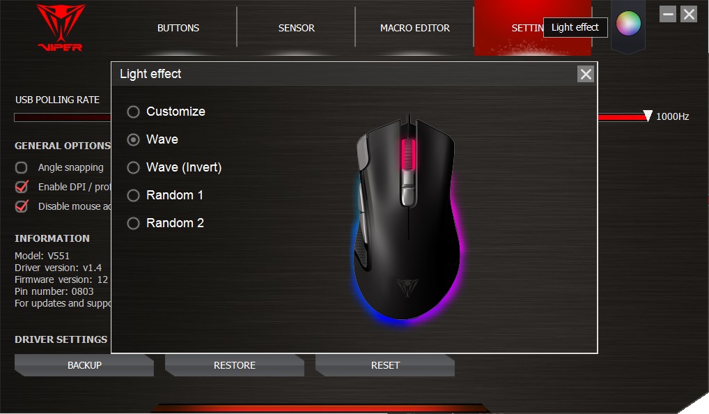 Driver settings allows you to “BACKUP”, “RESTORE” and “RESET” your “VIPER GAMING MOUSE” software. I have used all quite a few times, and the backup and restore functions are for the previous complaint… but I feel like it’s a hassle to update/reinstall if you don’t need to. Reset, if you messed up a setting, or changed something and forgot what the original settings was, click here and it will revert back to the initial settings.
