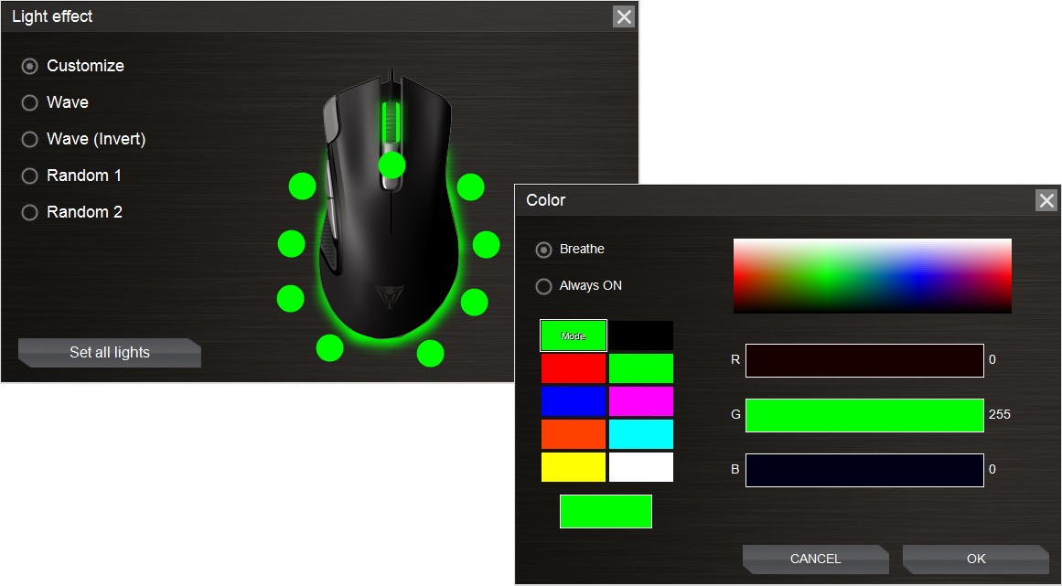 Lastly, on the top right-hand corner, when you click on the gradient globe, you can change lighting effects. Even though we have not talked about it much during this review, this is an RGB mouse after all.
