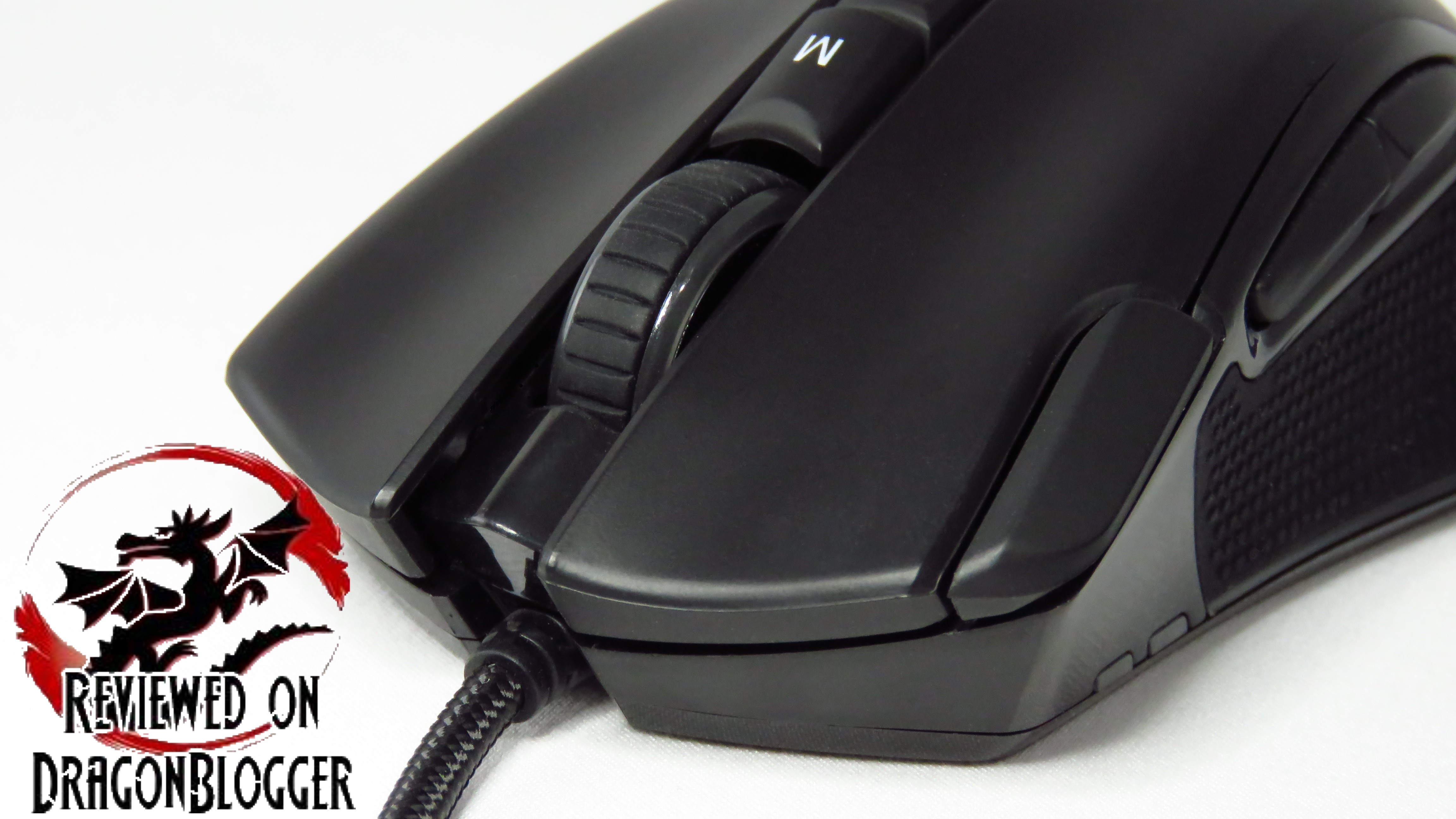 Along the top again we find the scroll which has a firm roll. Behind that, we find the M key, the M key by default when pushed changes between the 5 saved and pre-defined profiles. Behind the M key, we find the DPI selector key, which as the name implies, allows you to change between the 5 DPI pre-defined selection and then the good ol’ right button.