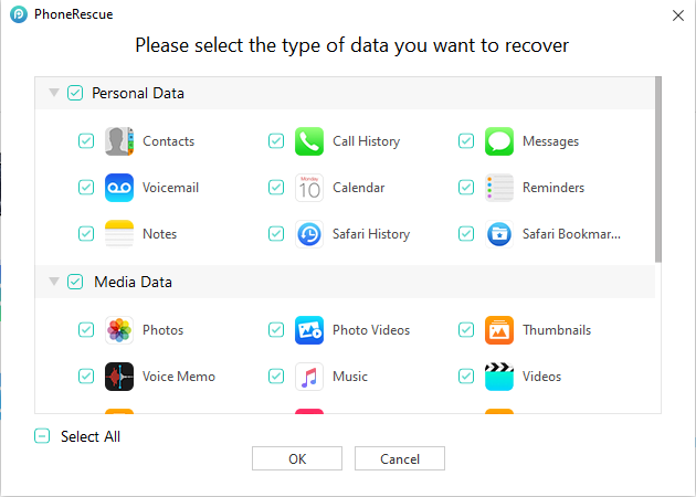 Select the type of data that you want to recover and click on ‘OK’. PhoneRescue will start scanning for deleted as well as existing files and list them. Select the files that you want to recover and then click on