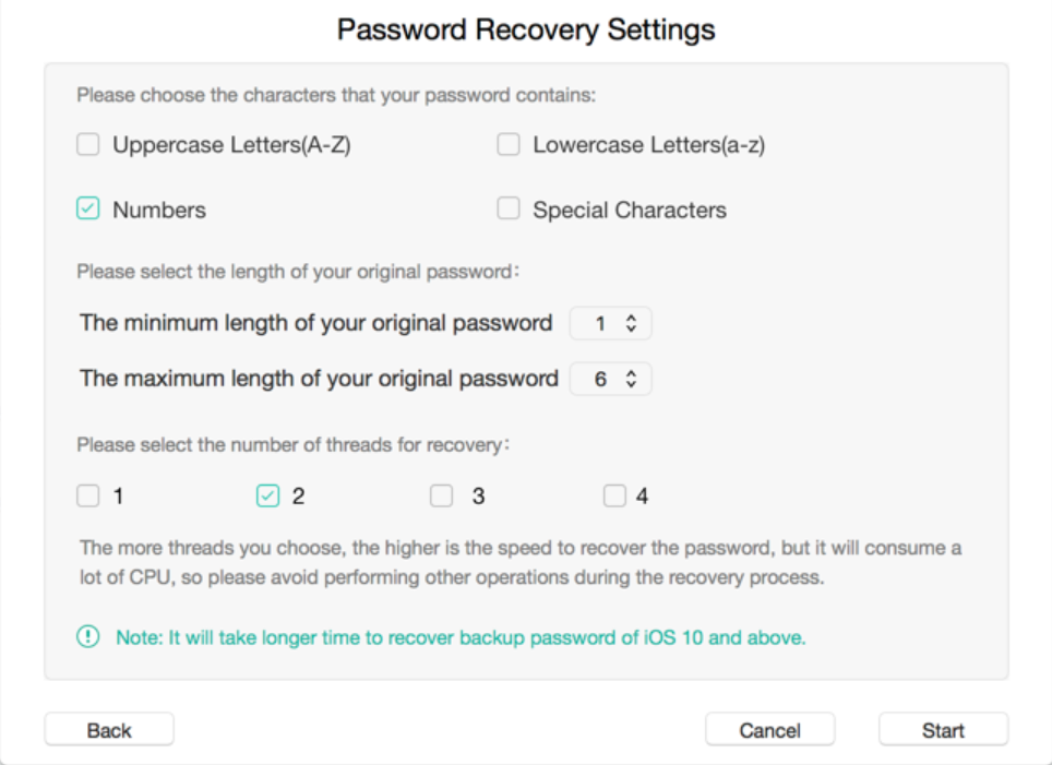 In case your backup is encrypted, you will be asked to decrypt it by entering the password. And like me, if you have forgotten the password to your backup, then you can easily recover it by clicking on ‘Forgot Password’. Input the required details if you have a vague idea of your password and click on ‘Start’. The recovery time will depend on the password’s length and complexity and differ depending on your system. For a 3 character password comprising of just numbers, it took my system around 2 minutes.