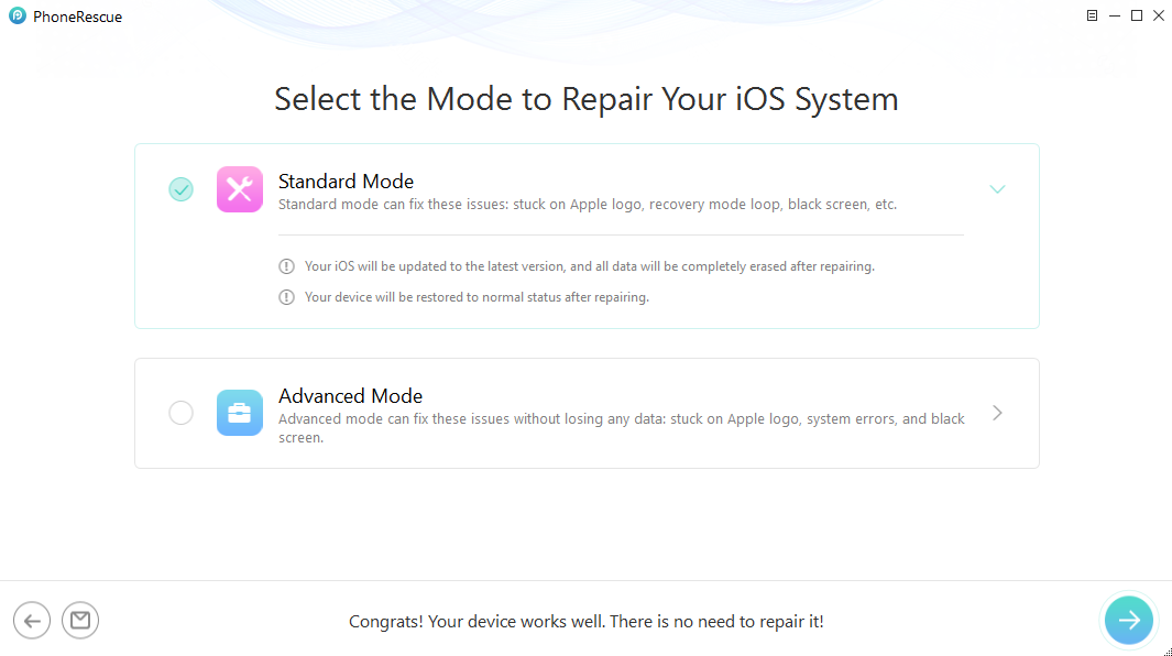 PhoneRescue offers two types of repair modes, Standard Mode and Advanced Mode. The Standard Mode will update your iOS device to the latest version and perform a clean wipe of the device which will delete all the data. The Advanced Mode will also update the device to its latest firmware version, and you will not lose any data. So you can choose the repair method depending on your preference. Simply follow the provided instructions by iMobie, and your device will be repaired. Check out this guide for more information.