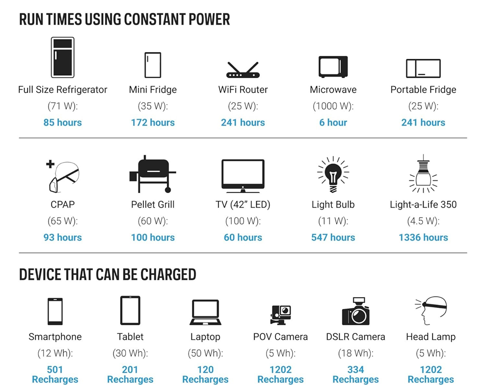 It can be recharged in multiple ways, as well as using super-fast charging technology. Despite having a large energy storage capacity (capable of supplying uninterrupted power for days), it can be recharged in just 8.5 hours from an outlet and in 8-10 hours using solar panels. Solar panels are not included in the starter kit, but there are two additional options to get this portable power station along with 2 x 200W solar panels or 2 x 300W solar panels. Solar charging is great because you can save on electric bills, plus it’s the best way to keep using your portable power station while camping.
