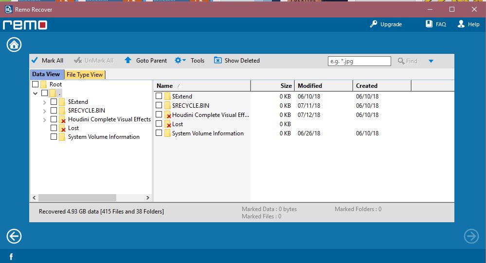 The software will scan for deleted files and show you this screen. On the bottom, you can see that the software has managed to recover 4.93GB data which included 415 files and 38 folders. To see only the deleted files, click on show deleted.