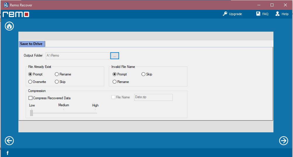 Here you will be asked where you want to save the file. Click on the “…” to select the output folder. DO NOT save the files in the same drive that the files were deleted from. Save the files in a different drive to get a perfect recovery. For the files that already exist, you can choose to Rename, Overwrite or Skip them. Or you can just leave it to Prompt and the software will ask you what you want to do for that particular file. You can also choose to compress the recovered data in case you don’t have enough space in the recovery drive. Click on the bottom right arrow in the corner once you are done and the software will start recovering the data.