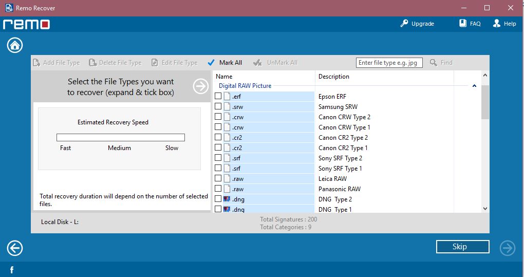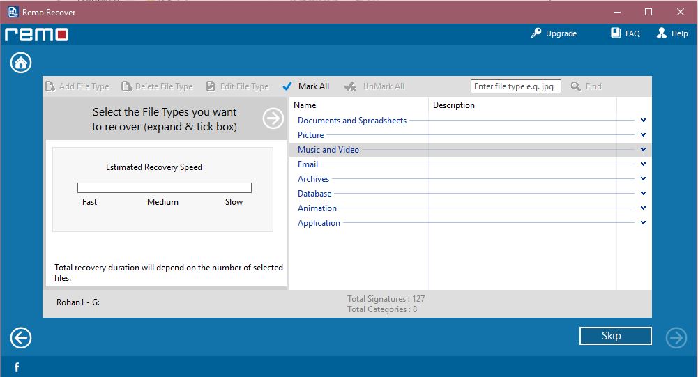 Here you can choose which file formats do you want the software to scan for. Selecting the specific file formats will result in a much faster search result. You can either select the file formats or you can totally skip it and the software will search for all the files which will result in a longer search time. Once that is done, clicking on the right arrow button on the bottom right will start the scan. The steps of recovering the files are exactly the same as shown above.