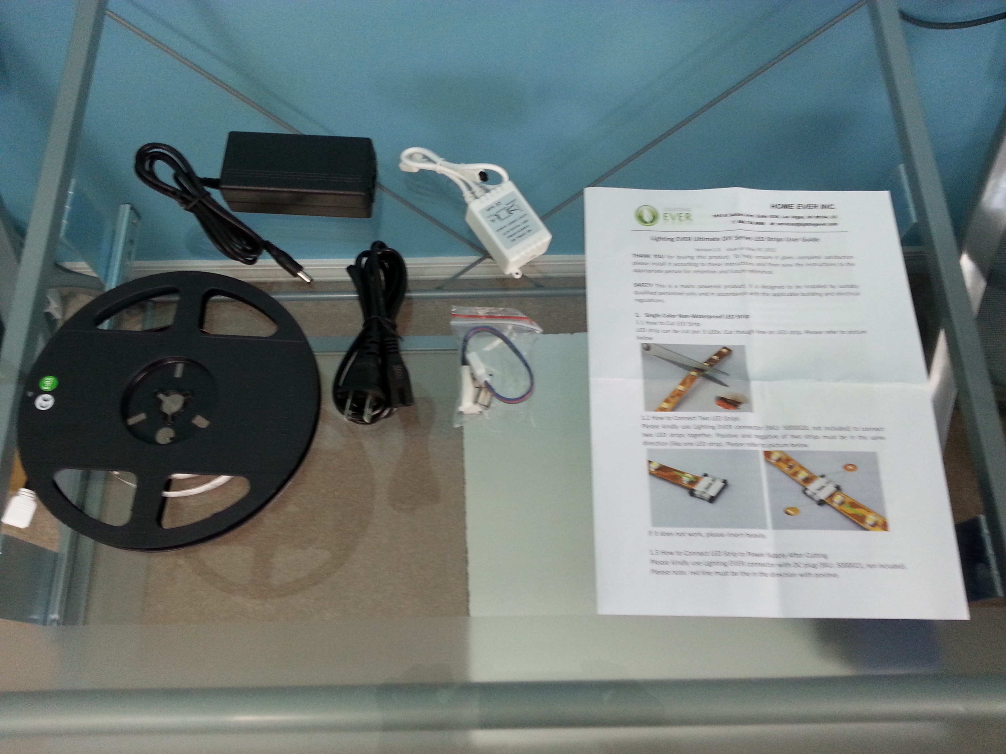 Included in the package is 2.5 meters of LED lights (black spool), the Lighting Ever instructions (paper), remote control box (white box), power source (black cords), a remote to control the color of the LED lights (not pictured), two LED connectors for connecting two or more LED strips (in plastic bag), and a cable to hook up the second strip of LED lights to another power source (in plastic bag).