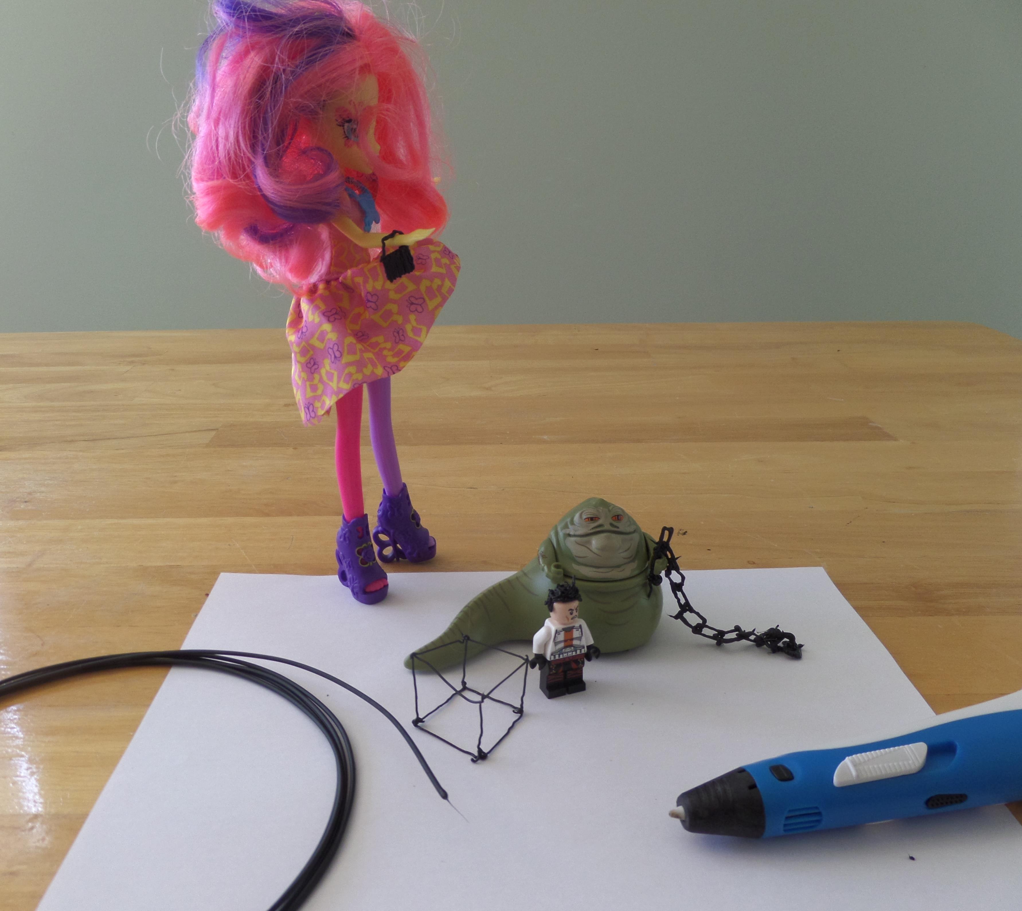 Hair for a poor follicly challenged Lego, a purse for Fluttershy and a chain for Jabba the Hutt, we can make so many things.  The chain seemed a little more complicated, it’s only complicated if you let yourself believe it is complicated.  It was pretty easy, and with more practice you can build a better chain or even cooler accessories for all your toys and gear around the house.  The chain was in fact my 4th 3D print, you have seen everything I have printed so far but the possibilities are endless.