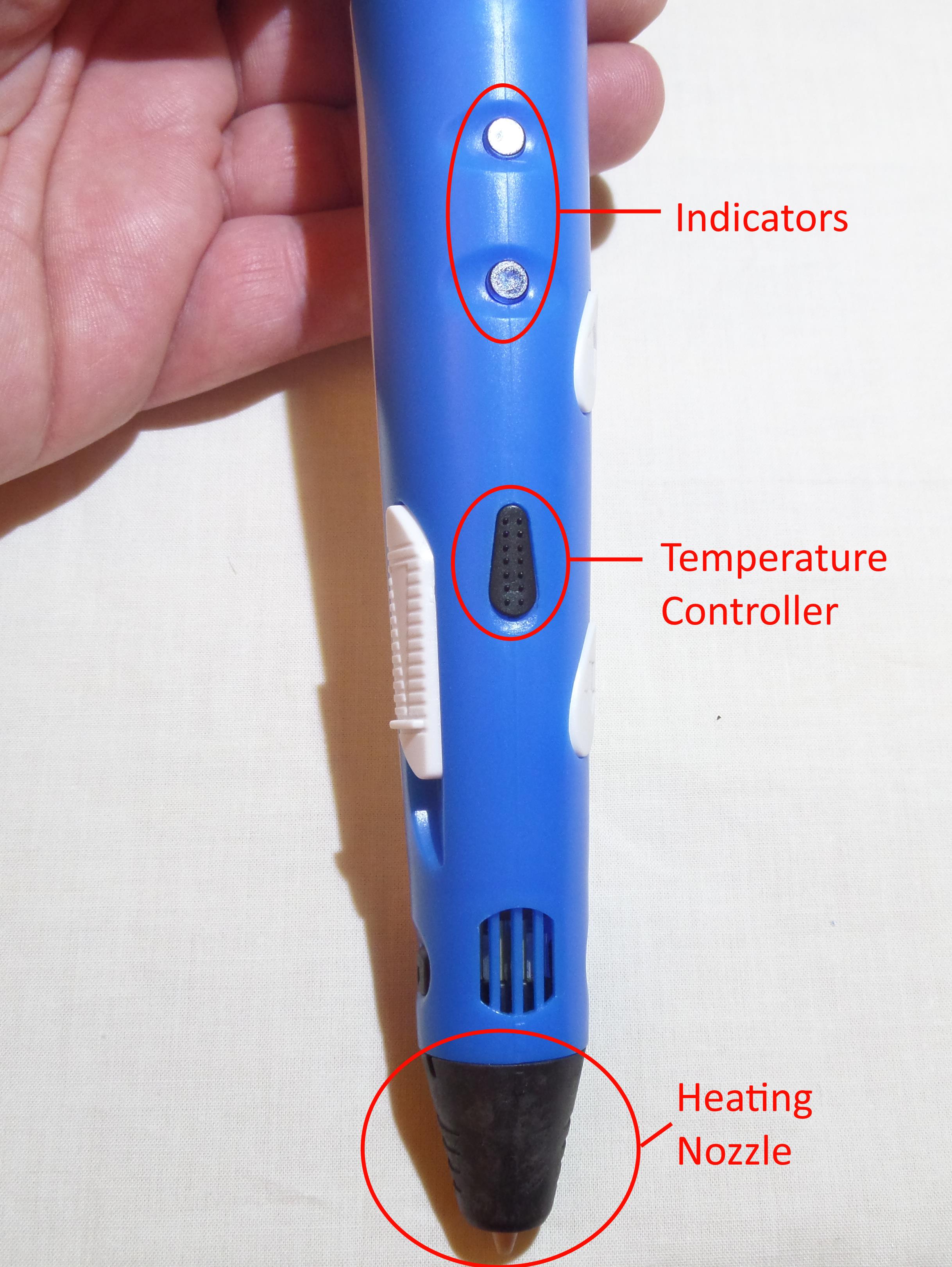 On this side of the 3D Pen shows 2 indicators, a Temperature controller and the heating nozzle.