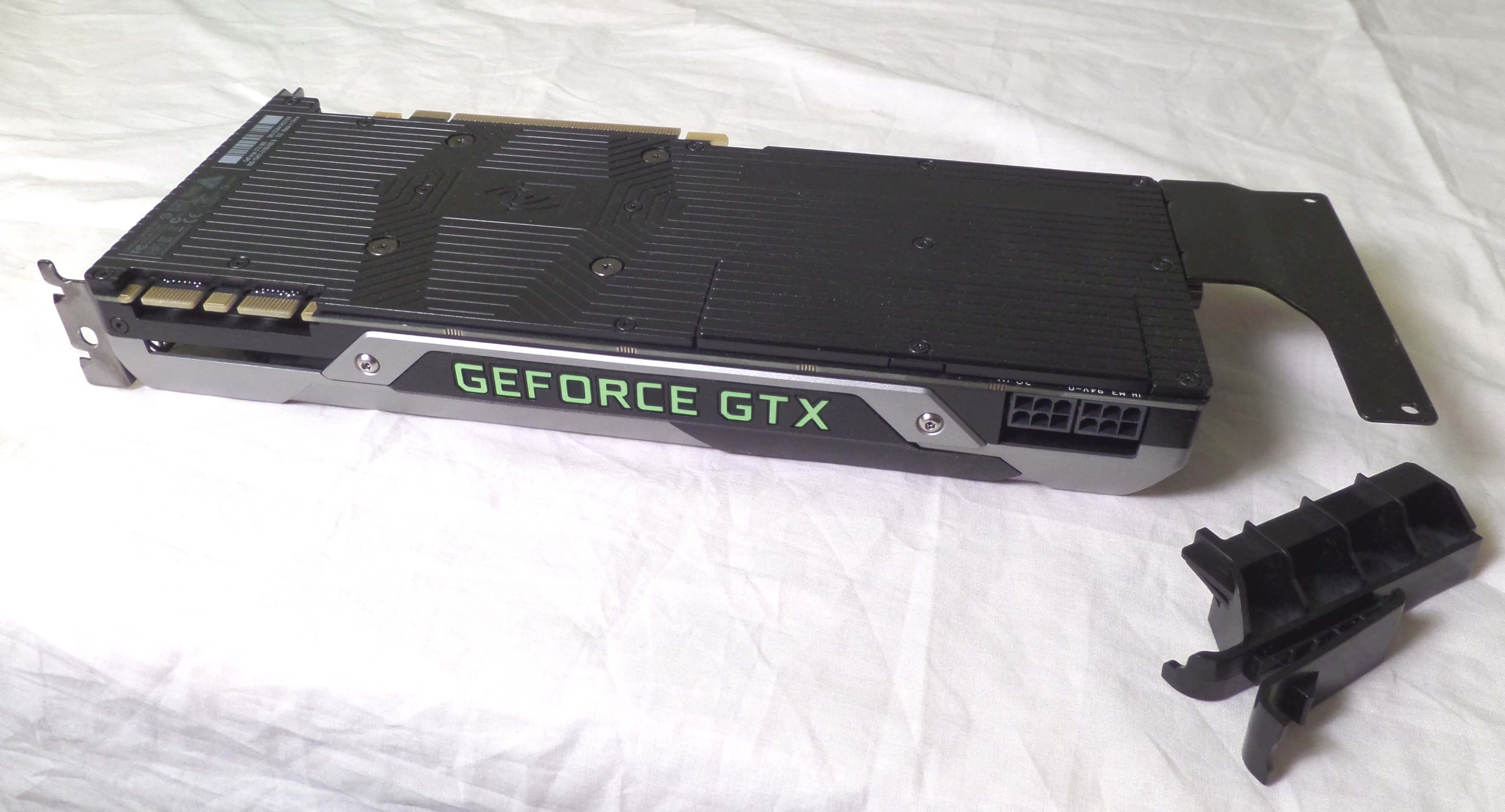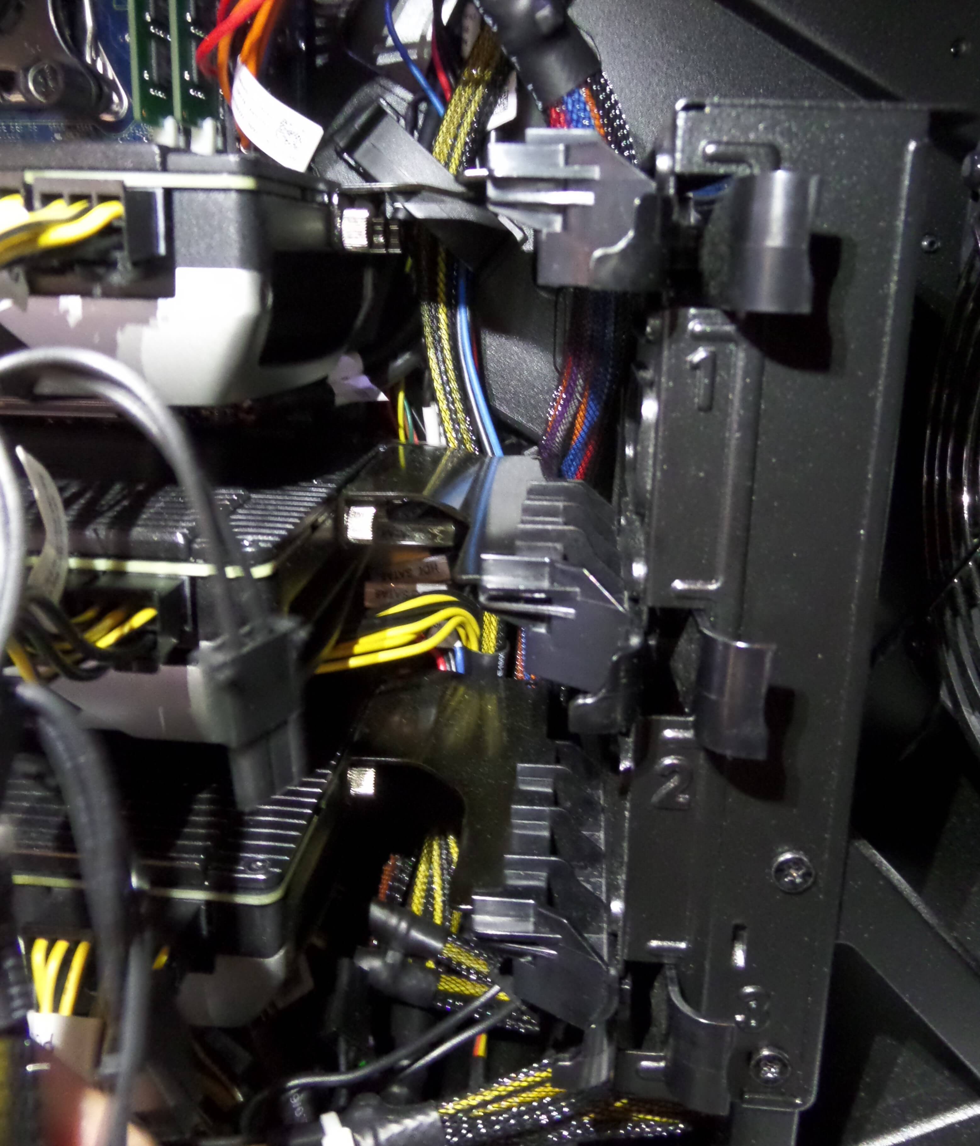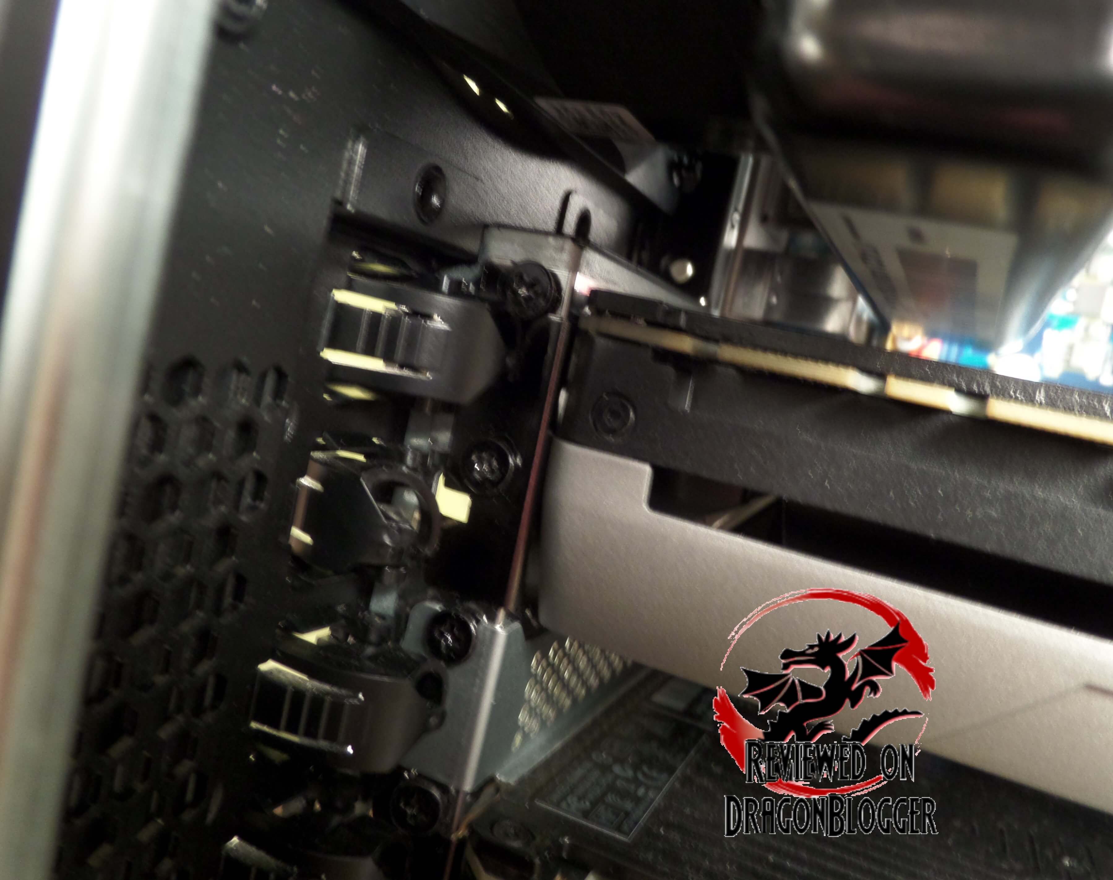 First off, you will notice the cards are in at about a 45-degree angle as I have mention before. Cool air comes in from the bottom up through the cards and more cool air from the top over the CPU to the top of the cards then vented out of the back of the machine. Taking a closer look at the card, shows that it is a nice looking card, though it has been fitted with a base to hold the cards in place to keep them from shifting potentially snapping during shipping.