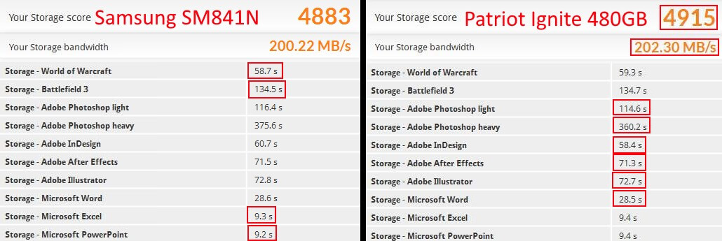 Comparing the 2, we can see that that the Patriot Ignite 480GB scored slightly higher, which means programs loaded just a few second fast. The most noticeable was the Adobe Photoshop heavy test, the Patriot loaded 15 seconds quicker than the Samsung SM841N.